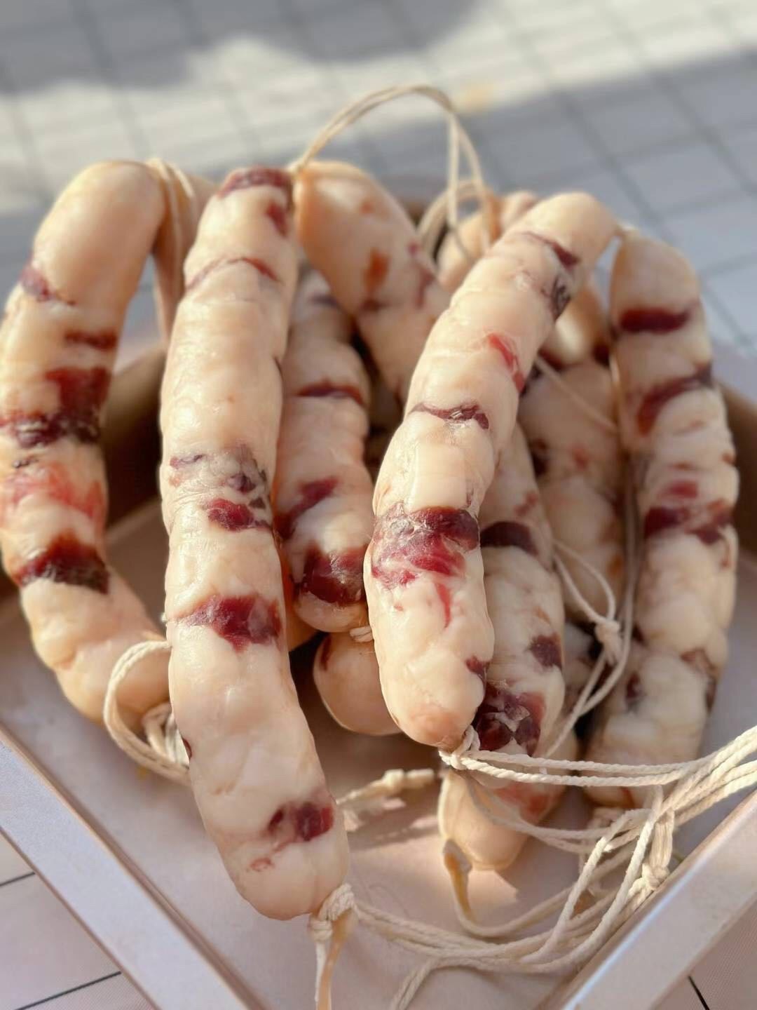 我爸说牙口不好吃不了瘦的,结果就装了这么肥的香肠我敢说滁州应该没有比这更肥的了,这东西说句不好听的,给狗吃,狗可能都嫌肥