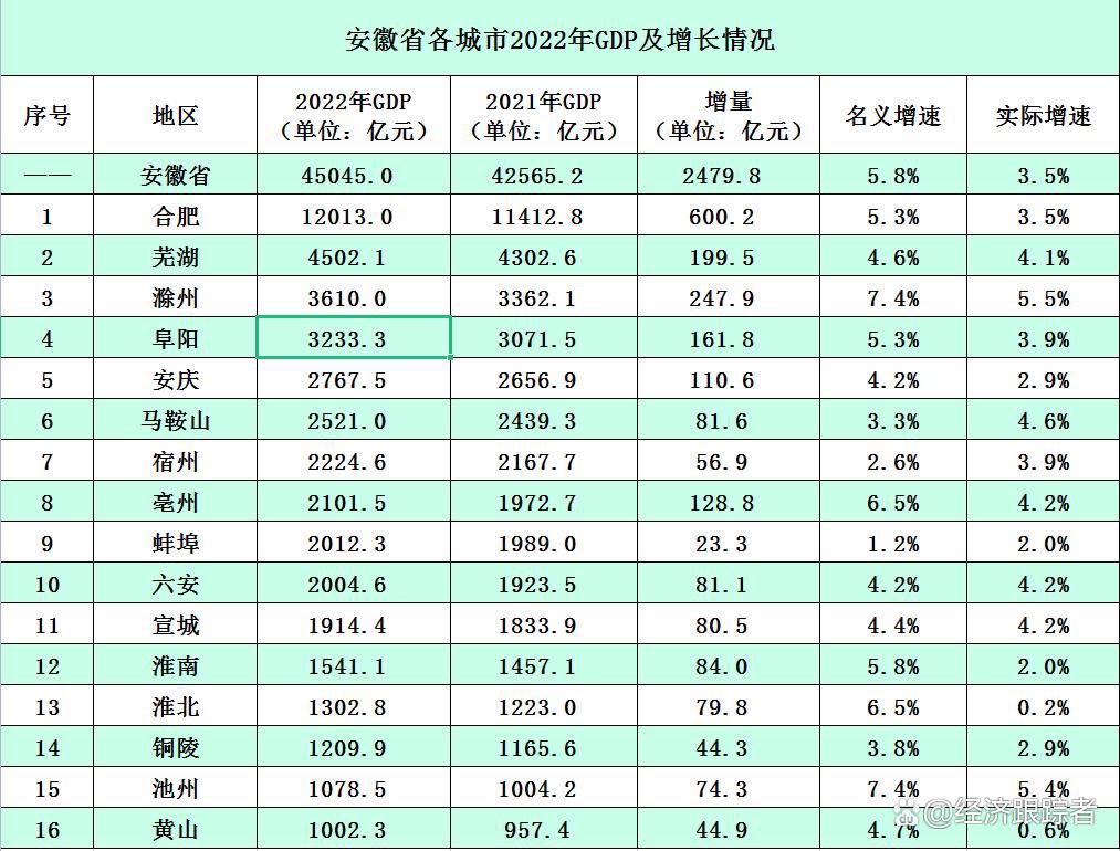 亳州市、蚌埠市、六安市2022年GDP均成功突破2000亿元大关,位居全省第八至十位,其中亳州市相比2021年名义增长速度达到6.5%,增速位居全省第三位,比全省增速平均值高了0.7个百分点;而蚌埠市相比2021年名义增长速度只有1.2%,在全省最低,2023年需要更加的努力,争取迎头赶上!