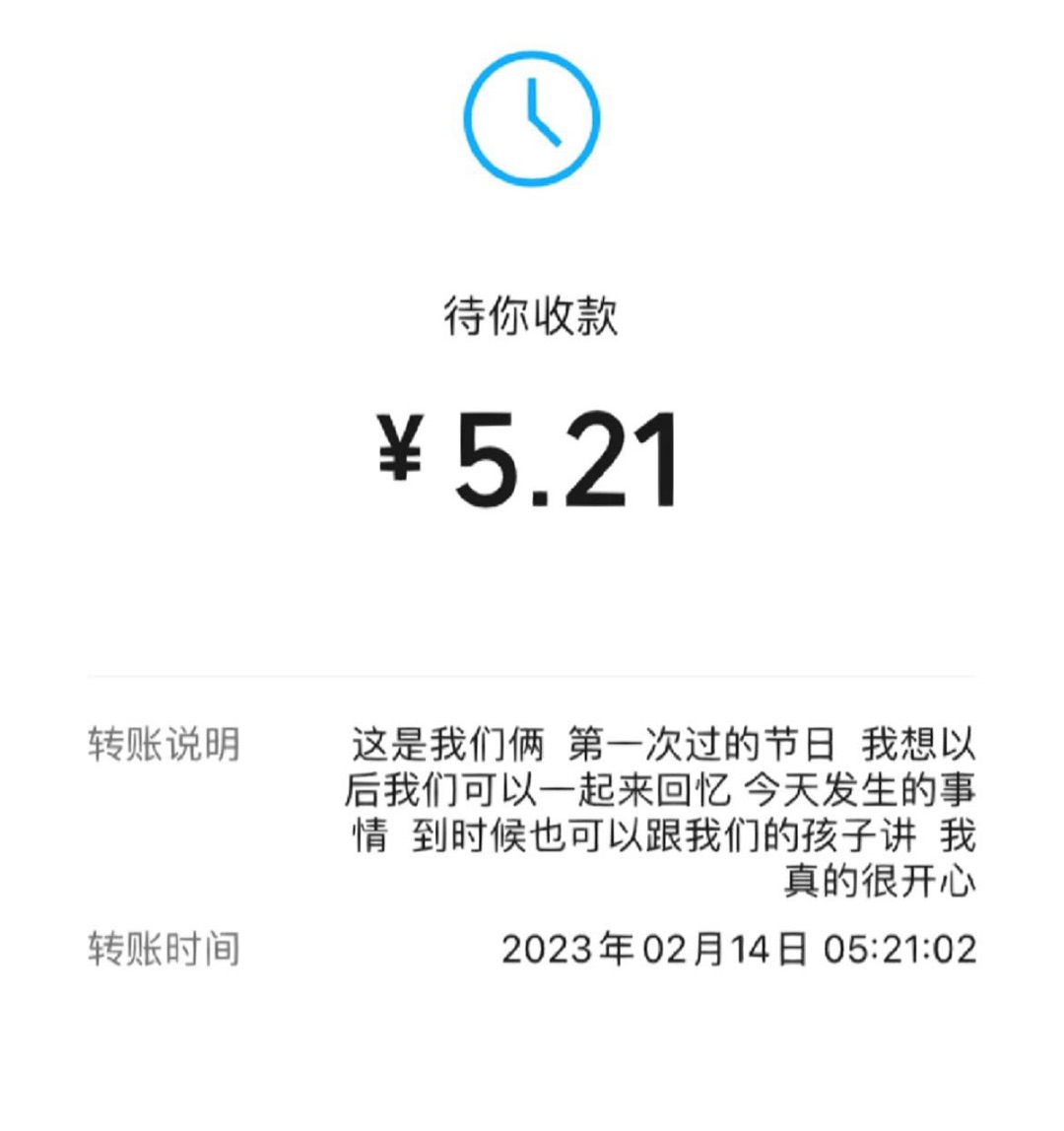 这就是情人节的转账!我随便给朋友买个礼物都好几百 真的没必要发出来给我 搞得我都堵的慌 (我也不缺钱)我过年给他买双AJ都不少了,小学生都不带这样的,现在出门买个辣条都得四五块呢吧