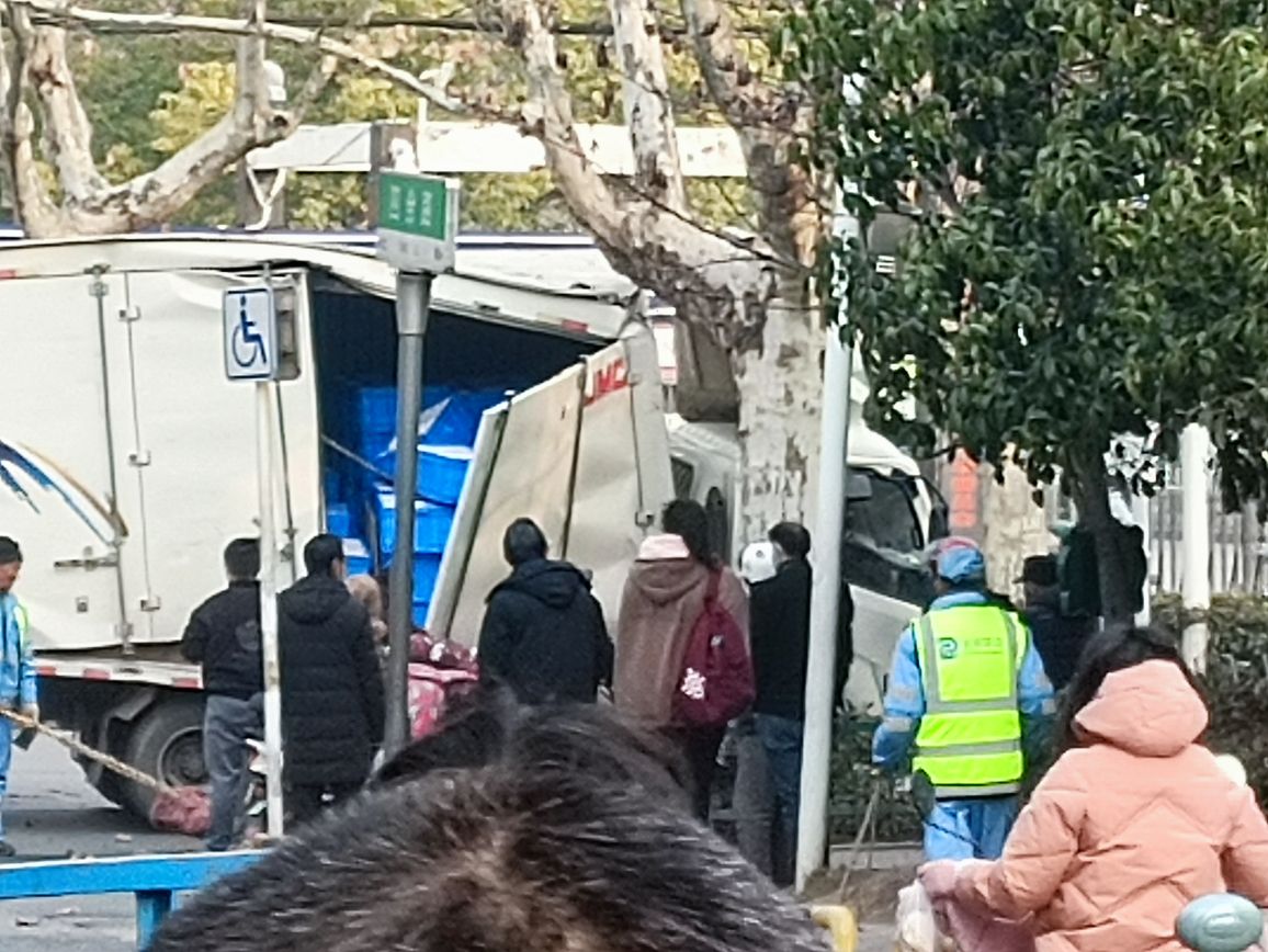 四和路二中对面,有一棵伸向路面的树,没限高,没警示,经常有车被刮。今天就比较严重,幸还的是车子驾驶员无事。