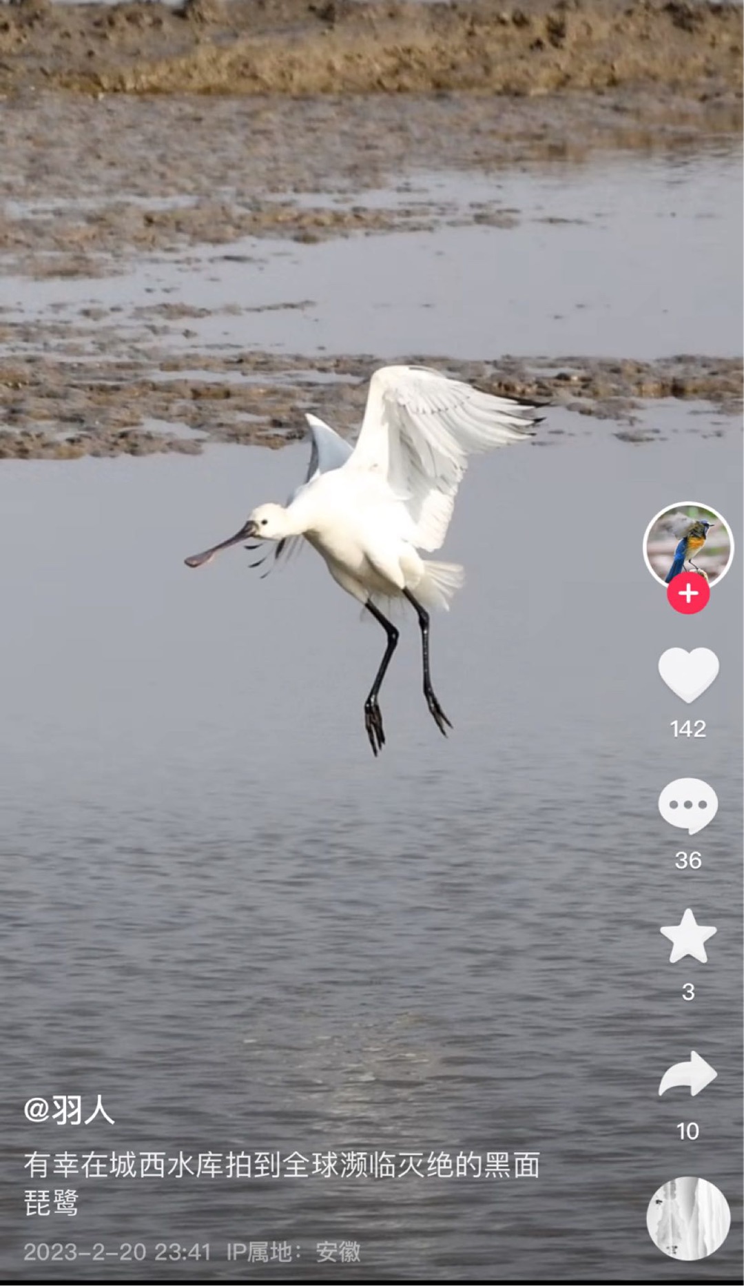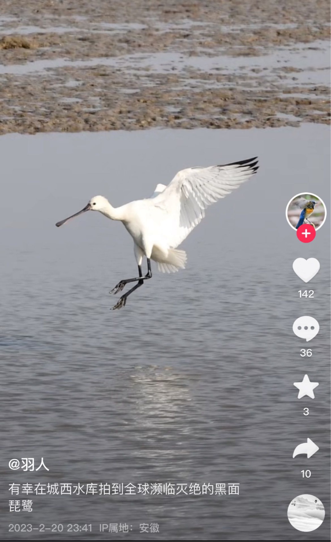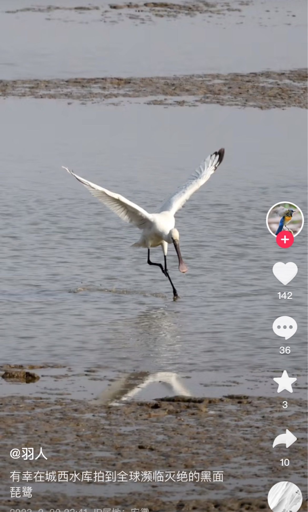 同城抖音上刷到,有网友在城西水库拍到了全球濒临灭绝的黑面琵鹭