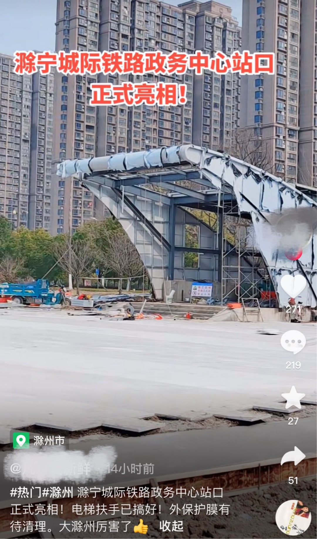 滁宁城际铁路政务中心站口正式亮相!电梯扶手已搞好!外保护膜有待清理,大滁州厉害了
