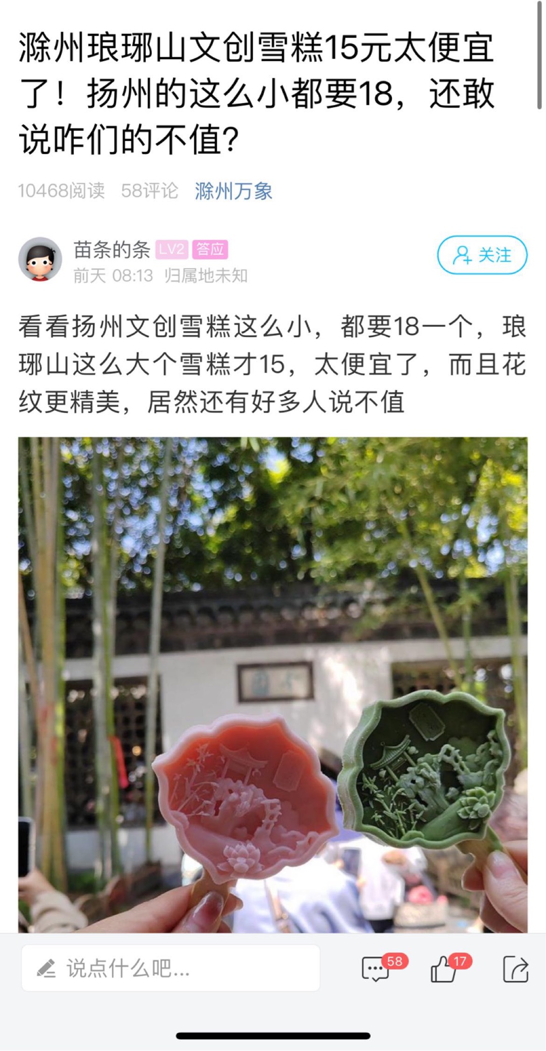 有人拿滁州的文创雪糕和人家扬州比,这能比吗,不是一个级别的旅游景区,客流量输一大截,真不丢人,咋们的旅游宣传也不如人家,人家雪糕卖三十几也照样有人买,琅琊山的卖三十几看可有人买,现在都卖20一个了,比人家还贵,哪来的底气卖这么贵的?