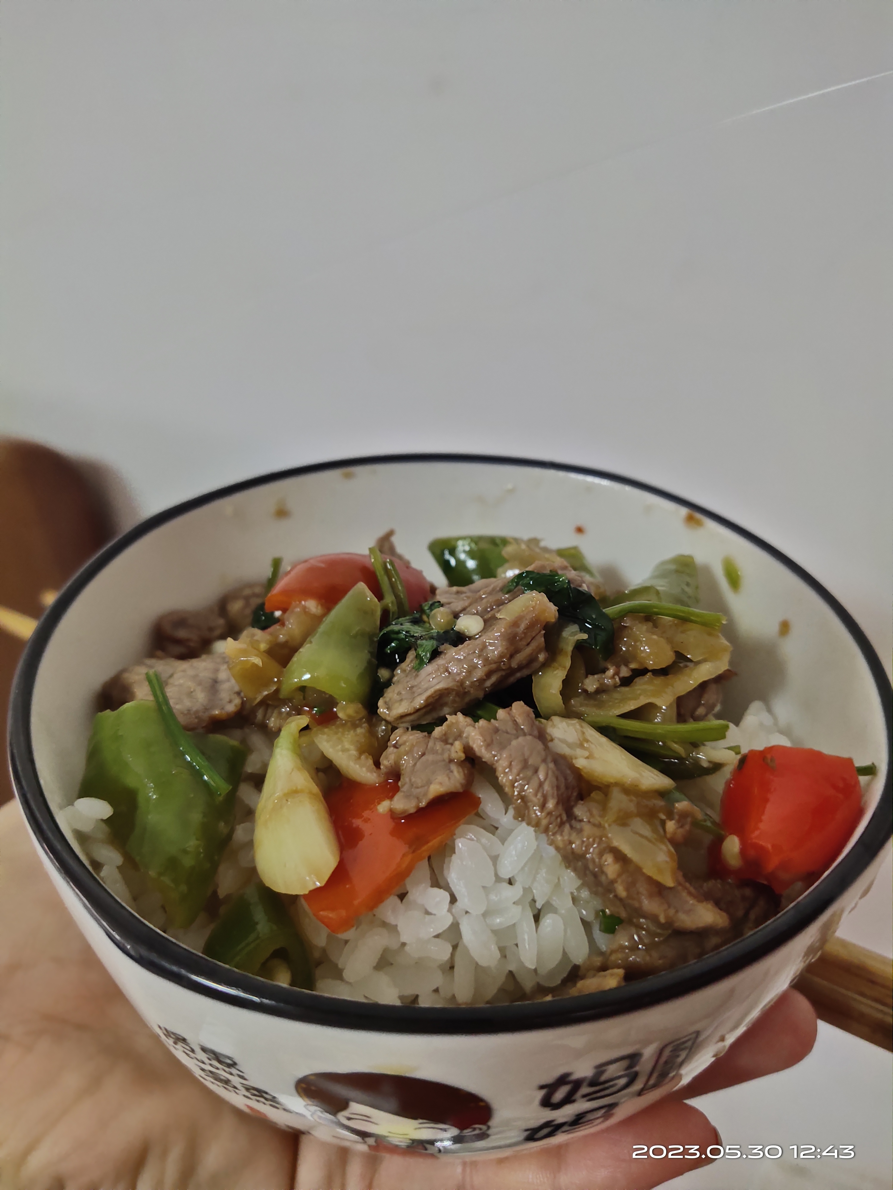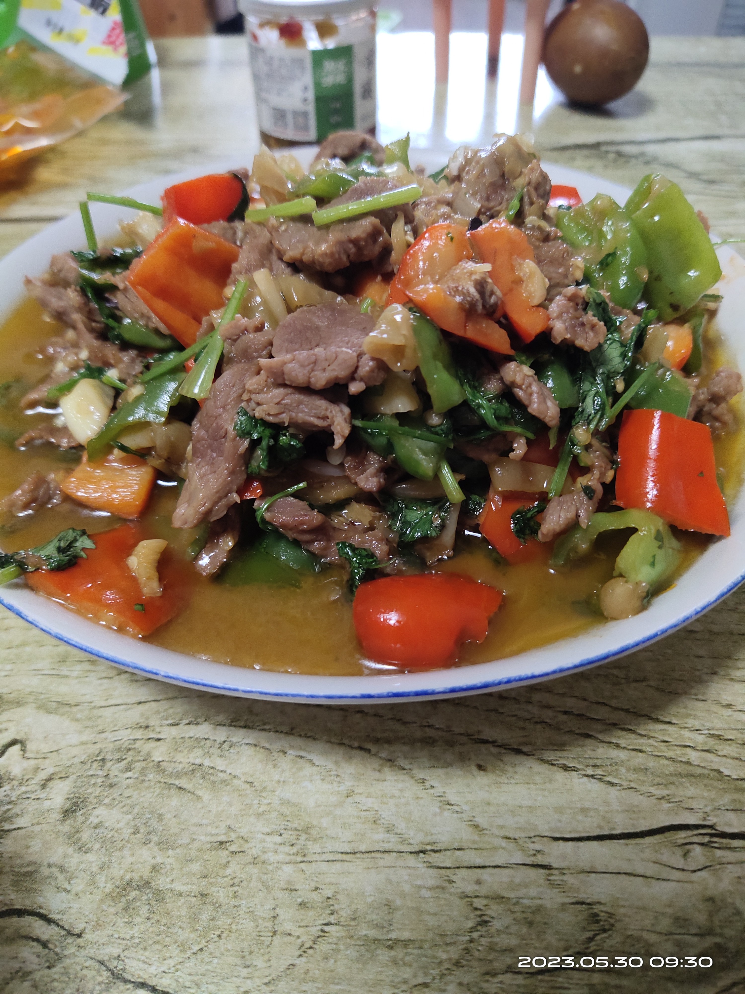 今天,终于在我的循循善诱之下,做出来味道差不多的“小炒黄牛肉”了!提前告诉他,牛肉怎么腌制,给他买好需要的配菜。然后让他发挥。结果就是炒了满满一大盘,我一口气吃了两碗饭。