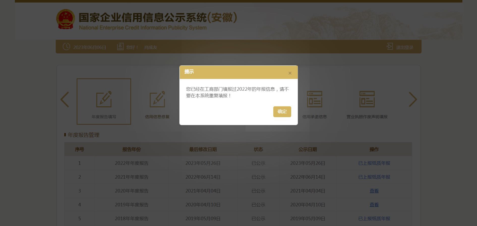 今天想起来给营业执照填写年度报告,登录进去以后点击填写就跳出下图这样显示,不知道什么意思,是今年不用填写了吗?执照上说6月30号之前在网上填写报告,我今年还没操作怎么就显示不用重复填写了呢?有没有懂得,给科普一下!