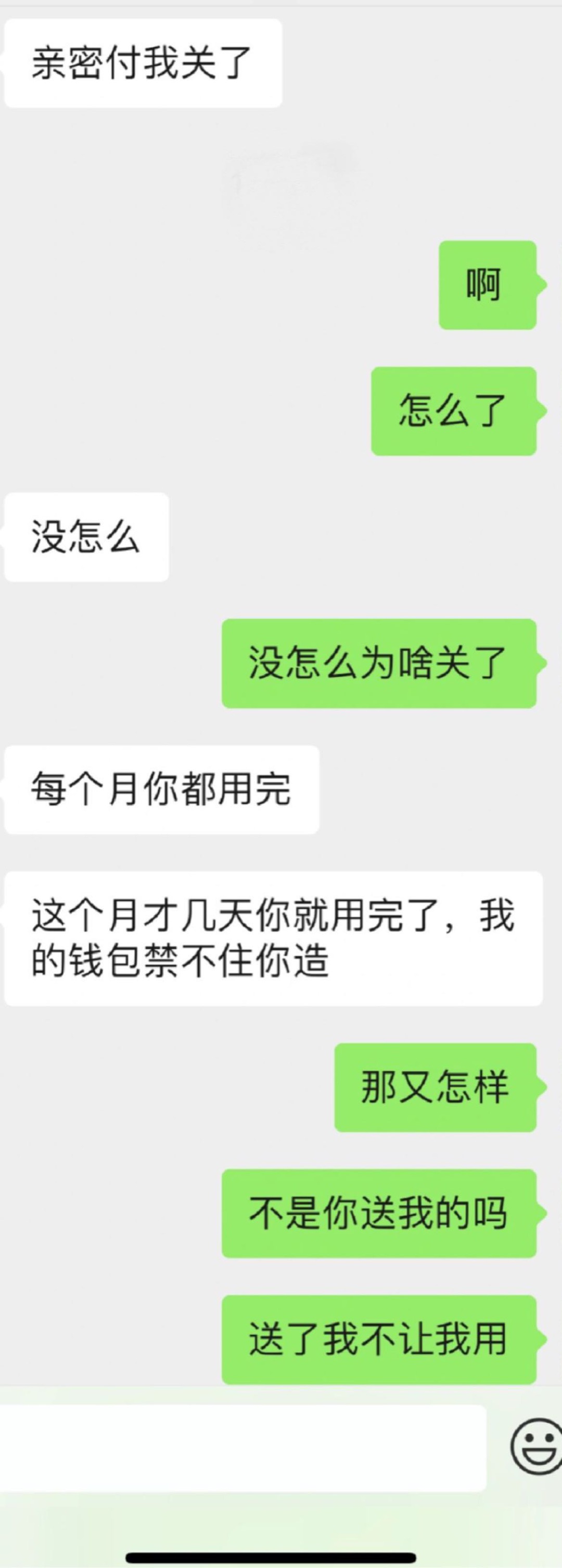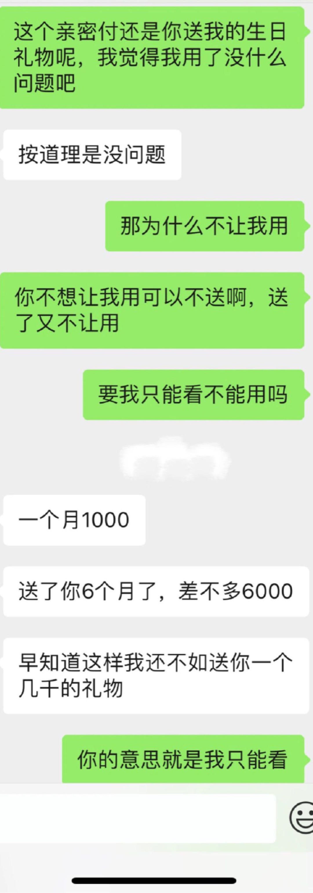 我过生日时男朋友送给我亲密付,说我随便花,就1000块钱而已,但现在因为我每个月都用完了他生气了,说要把亲密付给关了,我做错了什么??