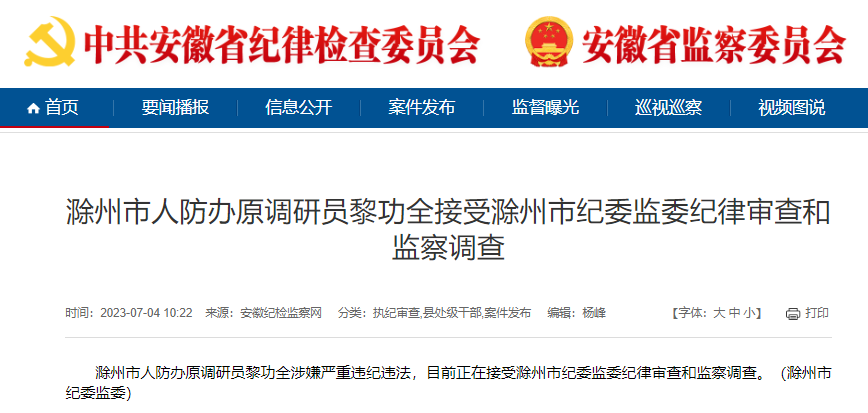 据安徽纪检监察网7月4日消息 滁州市人防办原调研员黎功全涉嫌严重违纪违法,目前正在接受滁州市纪委监委纪律审查和监察调查。