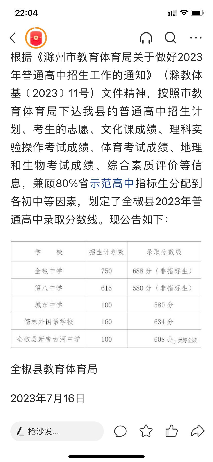 全椒中学高中录取分数线出来了