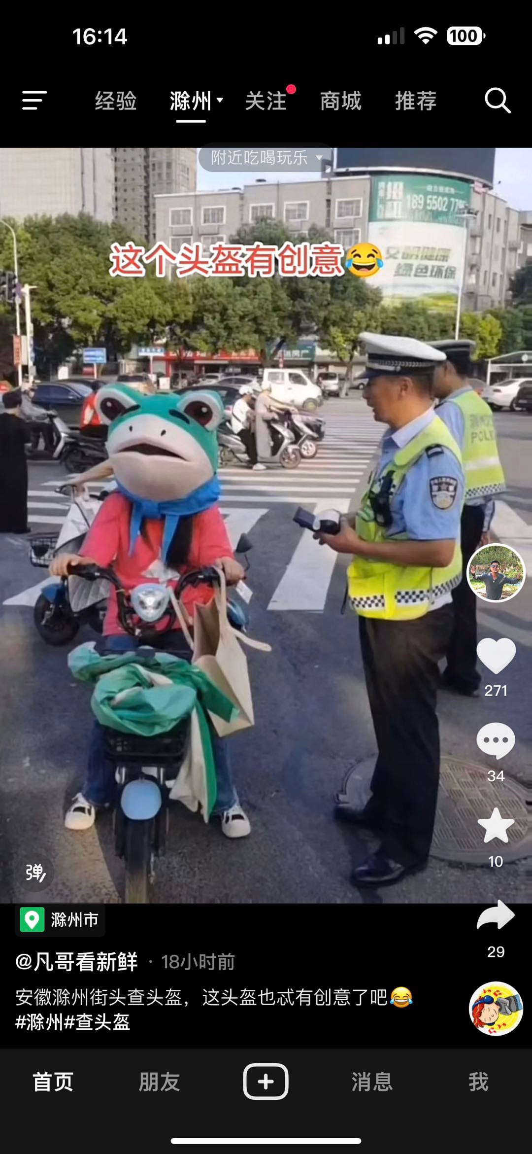 滁州人才就是多啊!交警街头查头盔,这人戴青蛙头套,笑死了,戴这个头套能看清路吗?