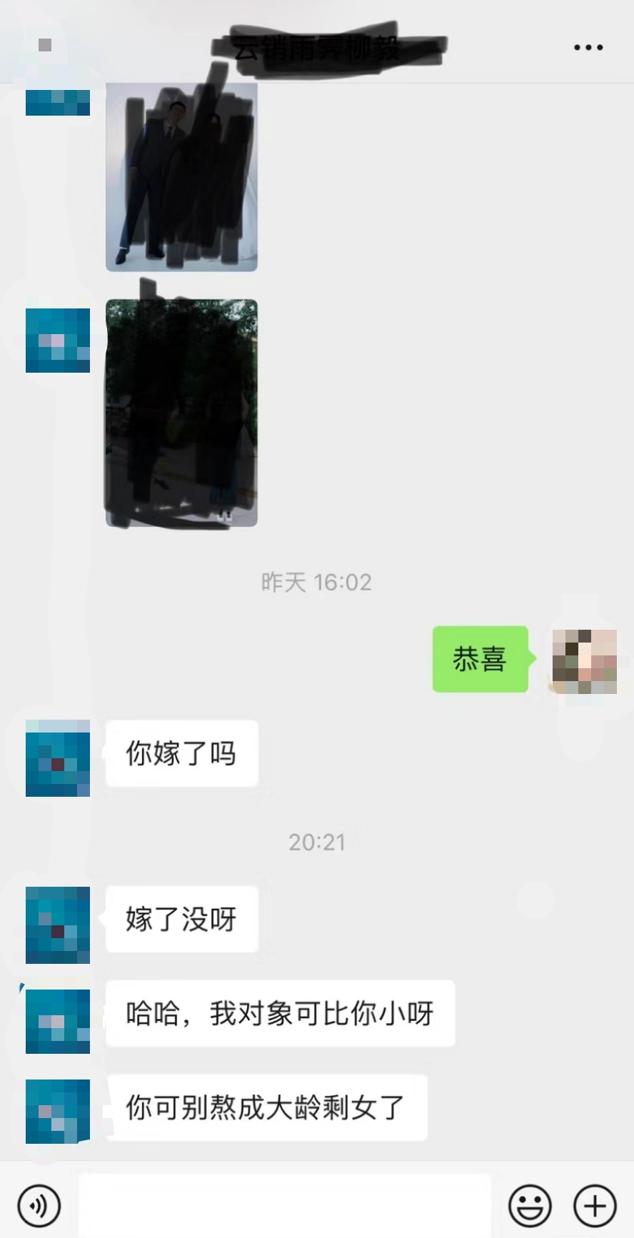 前男友结婚了,特意加微信来挖苦我,分手一年多没联系过,微信也都互删了,昨天上午突然加我微信发结婚照,发消息挖苦我,还笑我大龄剩女,就一整个大无语!