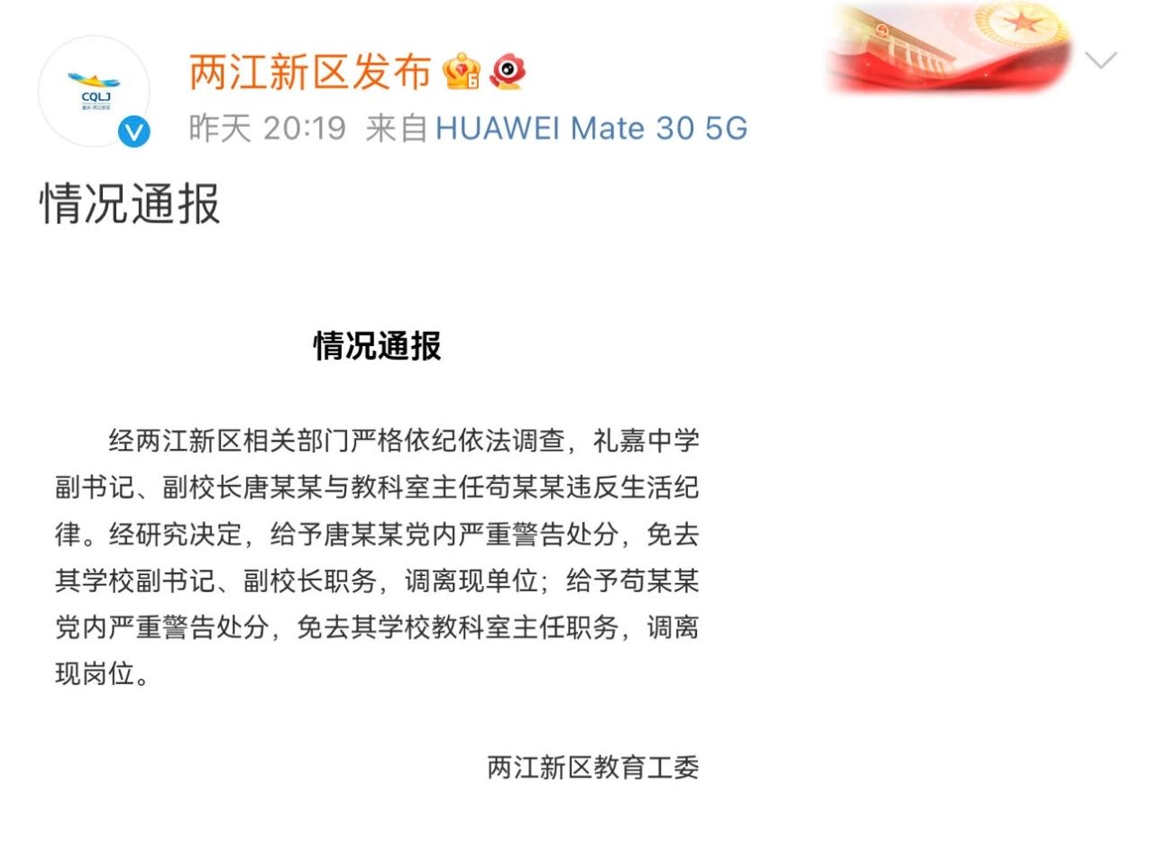 通报称:经两江新区相关部门严格依纪依法调查,礼嘉中学副书记、副校长唐某某与教科室主任苟某某违反生活纪律。经研究决定:给予唐某某党内严重警告处分,免去其学校副书记、副校长职务,调离现单位;给予苟某某党内严重警告处分,免去其学校教科室主任职务,调离现岗位。