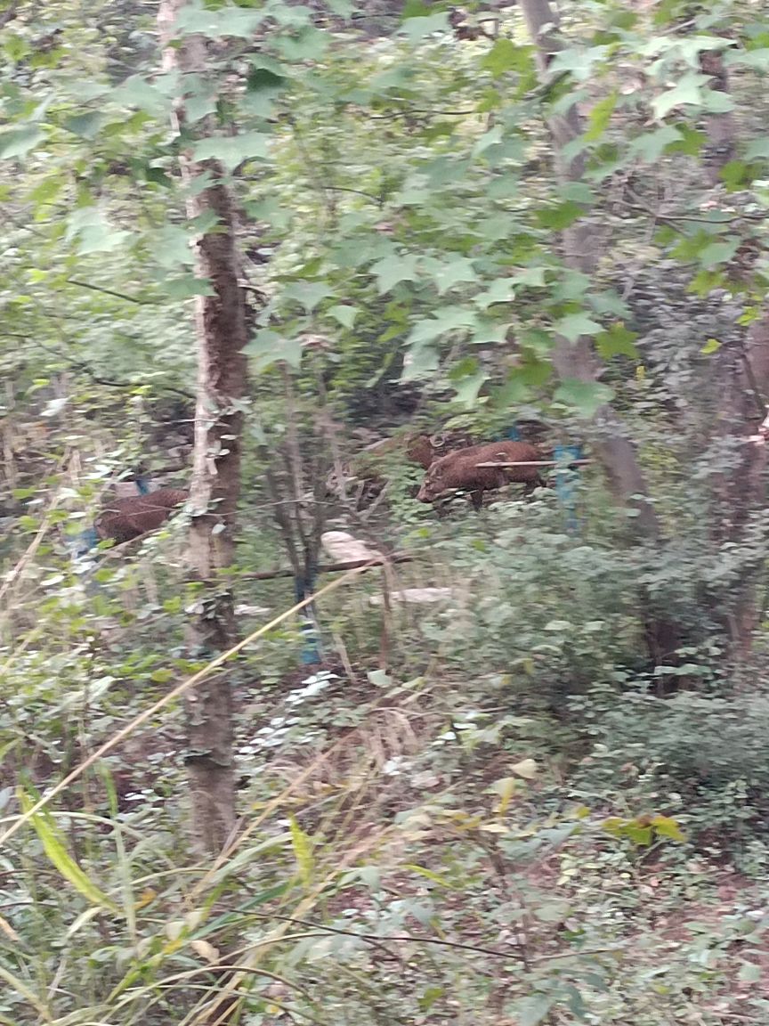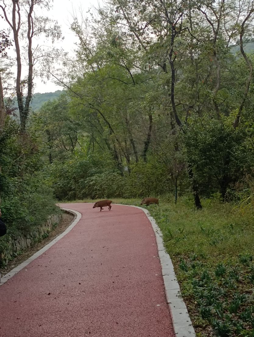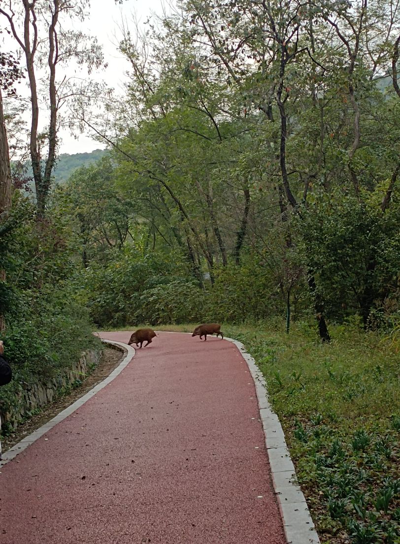 今天被吓着了,九头野猪啊,从旁边的树丛中横穿小路,这是一家子集体出来觅食了吧,最前面的大公猪目测有三百多斤,非常强壮,体型硕大,呲着大獠牙,好吓人!后面的小猪都有百十斤了,俩俩一起走,还挺有纪律的。进山锻炼的人一定要注意安全!