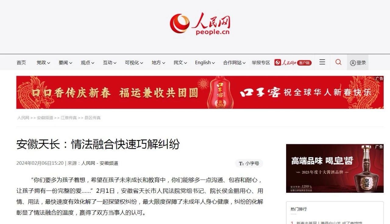 “你们要多为孩子着想,希望在孩子未来成长和教育中,你们能够多一点沟通、包容和耐心,让孩子拥有一份完整的爱……”2月1日,安徽省天长市人民法院党组书记、院长侯金鹏用心、用情、用法,最快速度有效化解了一起探望权纠纷,最大限度保障了未成年人身心健康,纠纷的化解彰显了情法融合的温度,赢得了双方当事人的认可。