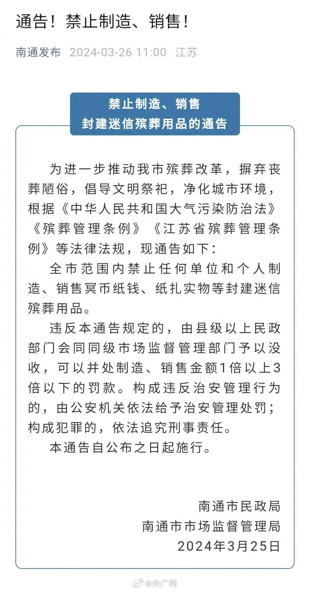 3月26日,南通市发布《禁止制造、销售封建迷信殡葬用品的通告》,要求全市范围内禁止任何单位和个人制造、销售冥币纸钱、纸扎实物等封建迷信殡葬用品。违反本通告规定的,由县级以上民政部门会同同级市场监督管理部门予以没收,可以并处制造、销售金额1倍以上3倍以下的罚款。对此,大部分网友认为烧纸钱“寄托了对亲人的思念”“是传统”,也有网友表示“换种祭祀方式也好”。