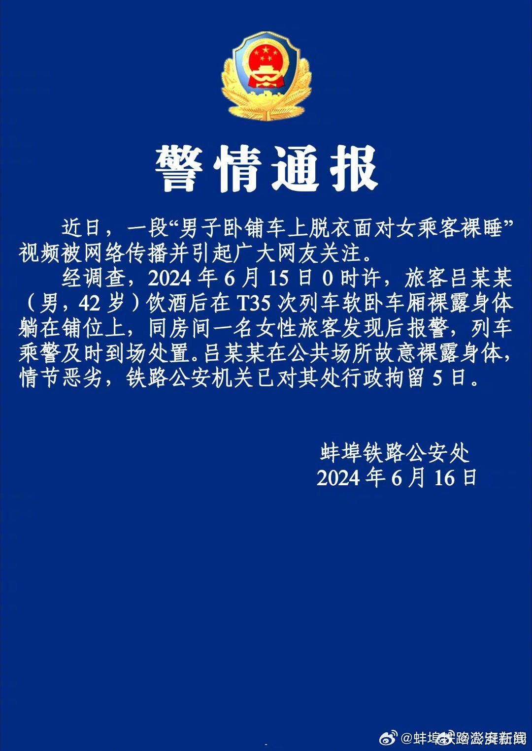 #警方通报男子在软卧面对女乘客裸睡#【警方通报“男子在软卧车厢面对女乘客裸睡”:行拘5日】#男子卧铺车上脱衣面对女乘客裸睡# 安徽蚌埠铁路公安在线官方微博发布警情通报。