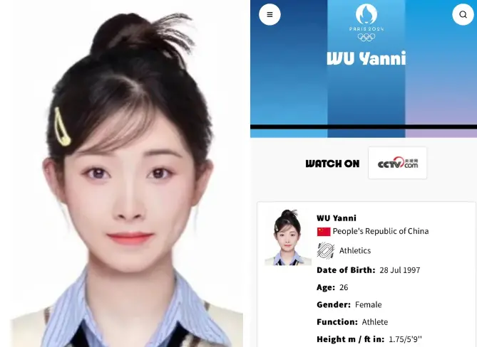 巴黎奥运会官网公布了吴艳妮的证件照,照片中的吴艳妮,青春靓丽,自信大方。