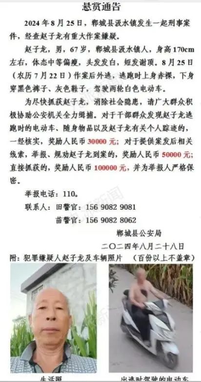 悬赏通告显示,8月25日,郸城县汲水镇发生一起刑事案件,经查赵子龙有重大作案嫌疑。赵子龙,男,67岁,郸城县汲水镇人,身高170cm左右,体态中等偏瘦,头发发白,短发谢顶。8月25日(农历7月22日)作案后外逃,逃跑时上身赤裸,下身穿黑色裤子、灰色鞋子,驾驶两轮白色电动车。