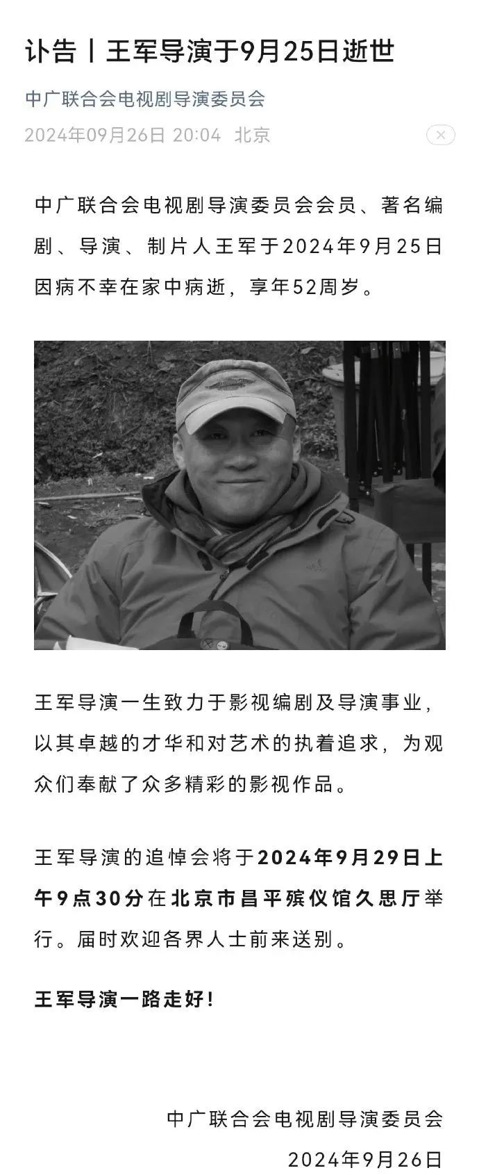 9月26日晚,中广联合电视剧导演委员会发布讣告,《金粉世家》《台湾巡抚刘铭传》编剧王军9月25日因病在家逝世,享年52周岁,追悼会将于9月29日举行。