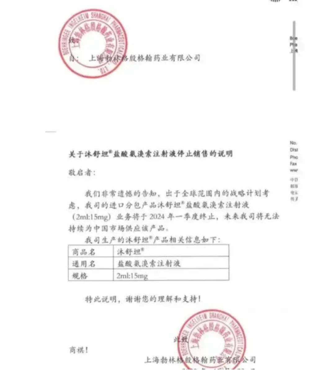 另据公开报道,明星止咳药沐舒坦(盐酸氨溴索注射液)也于2024年第一季度退出中国市场。