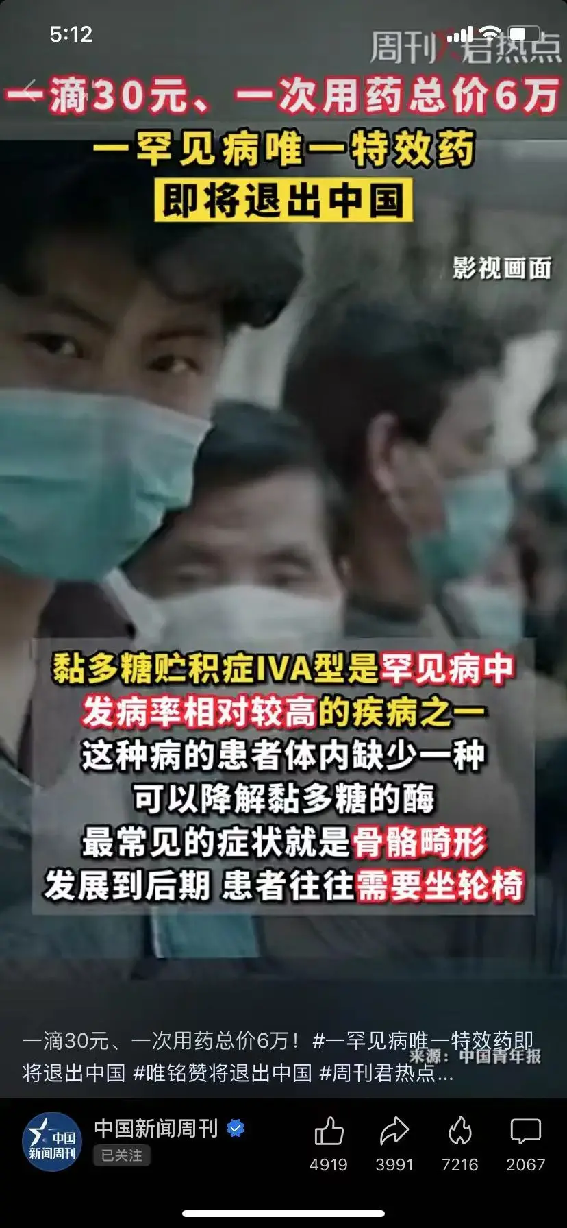 “唯铭赞”是目前全球唯一治疗黏多糖贮积症IVA型的药品,MPSIVA是一种典型的罕见病,症状包括生长迟缓、脖子异常短等。这款药曾以天价而引发广泛争议。