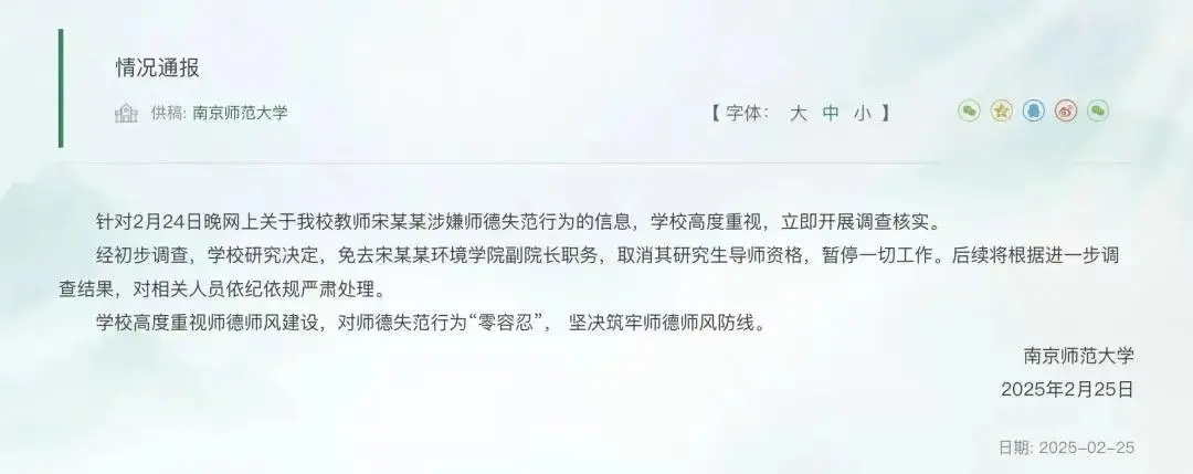 《南京师范大学一副院长被指婚内出轨女博士生,校方通报:宋某某被免职,暂停一切工作》。