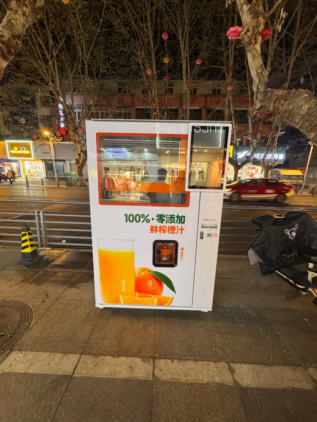 滁州街头天长东路出现自动榨橙汁机,11.9元一杯。机器科技感十足