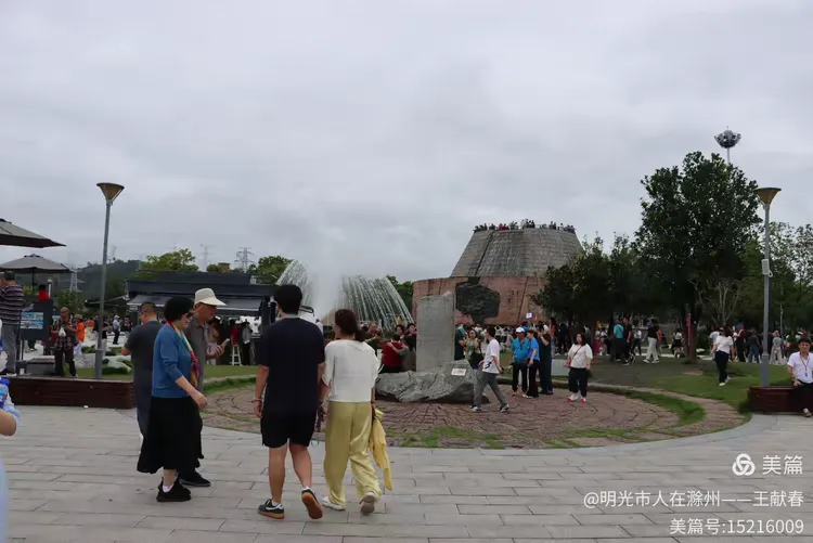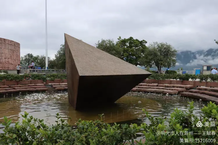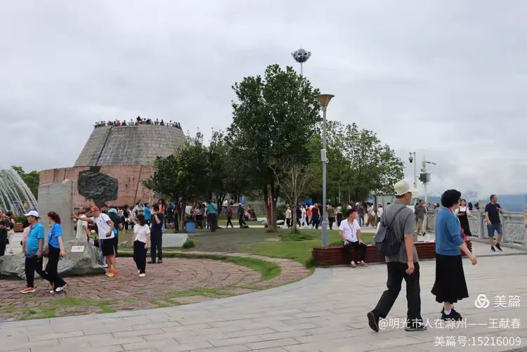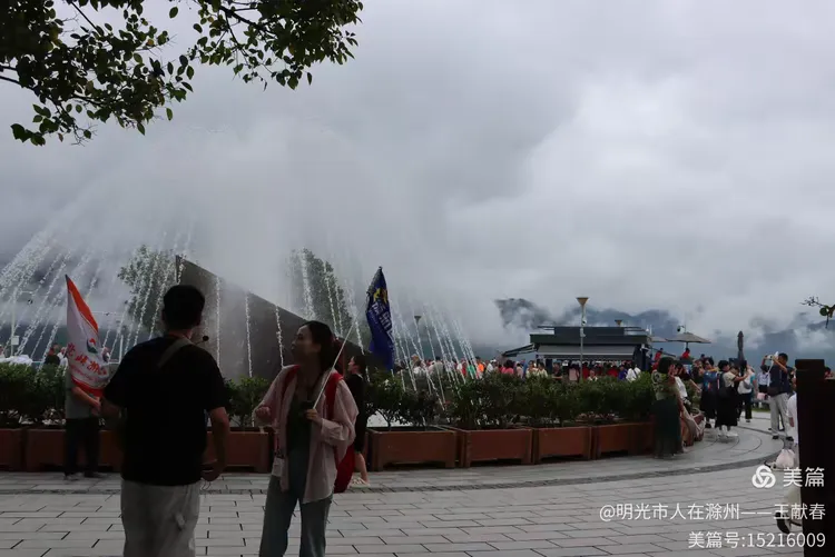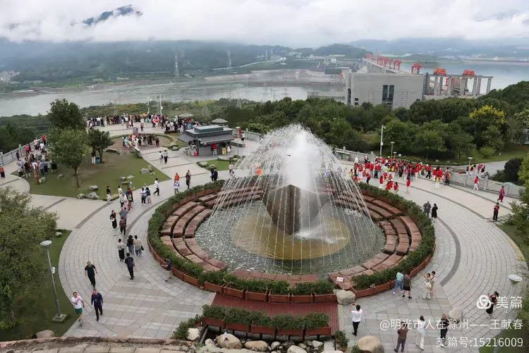 继续前行,我来到了一个圆形广场,中央的喷泉正缓缓喷涌,水珠在空中划出优美的弧线。广场上已经有不少游客在散步或拍照,背景是远处的水电站和连绵的山脉。天空多云,阳光透过云层洒下,给整个画面增添了几分柔和的色彩。我站在喷泉旁,感受着水珠溅落在脸上的清凉,心中满是宁静。