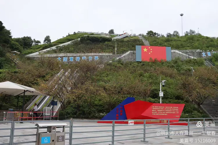穿过入口,我沿着台阶缓缓而上,一边欣赏着四周的景色,一边回忆起七年前的点滴。远处的山丘上,一面巨大的中国国旗在风中飘扬,与周围的绿色植被形成鲜明对比。我站在台阶上,望着那片宁静而有序的景象,仿佛时间从未流逝。