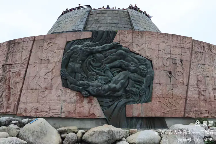 最后,我来到了一座大型的雕塑纪念碑前,雕刻着一群肌肉发达的人物在搏斗,背景是石质的浮雕图案,顶部有游客在参观。我站在雕塑前,感受着历史的厚重与艺术的魅力,心中满是对这座伟大工程的敬意。