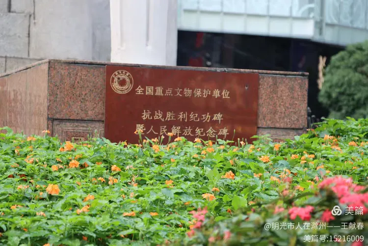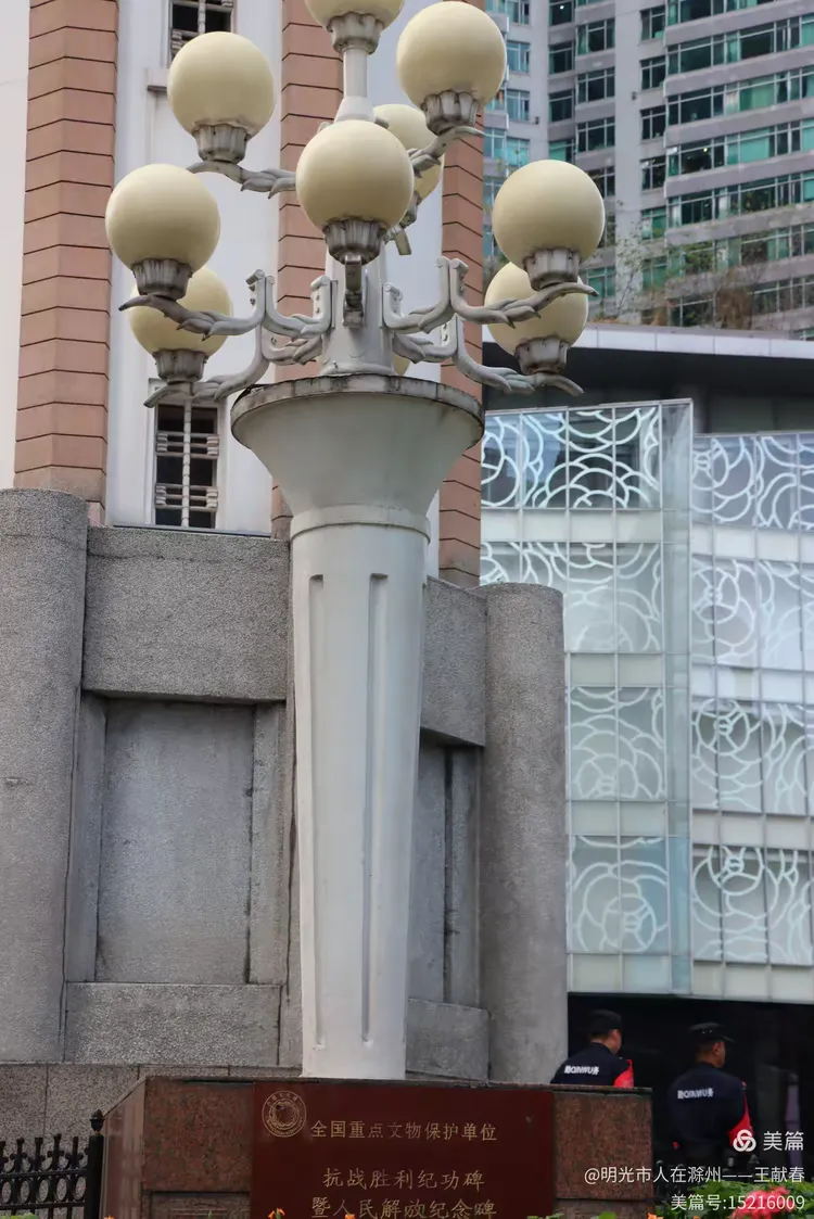 走近碑体,我看到下方一块石碑,刻着“全国重点文物保护单位 抗战胜利纪功碑暨人民解放纪念碑”的字样。碑身虽历经岁月洗礼,却依旧庄严肃穆。绿植与花朵环绕,仿佛在默默守护这段不能被遗忘的历史。