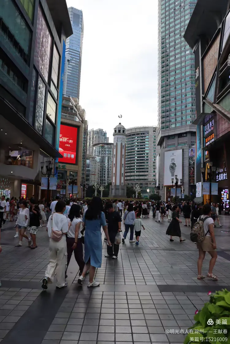 广场上人来人往,热闹非凡。解放碑周围早已不是记忆中的模样,曾经的老街、老店早已被现代化的商业综合体取代。我试图在脑海中拼凑出三十年前的画面,但眼前只有繁华的步行街、闪烁的广告牌和川流不息的游客。钟楼依旧矗立,但钟声之外,更多的是都市的喧嚣。