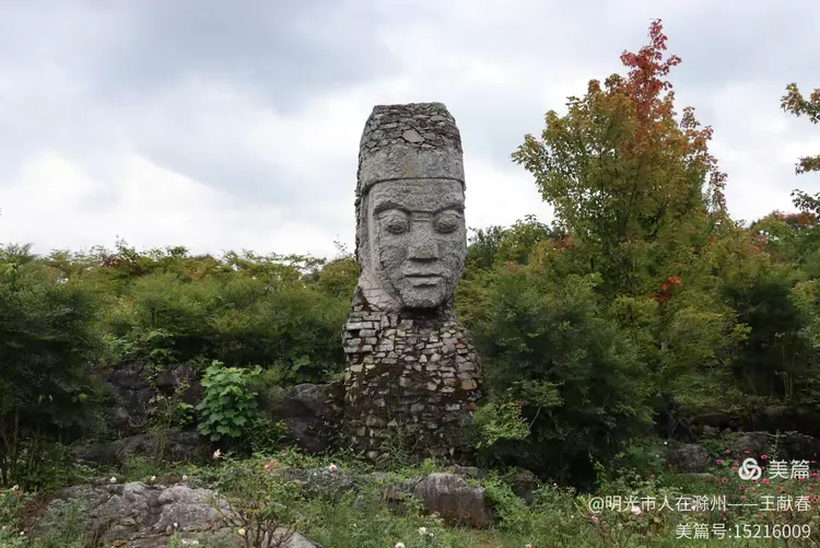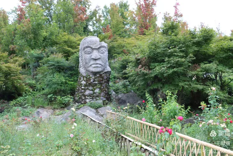 走过一条铺着黄色标线的道路,道路两侧是绿色植物和一座大型石雕,石雕上有着夸张的面部表情,背景是茂密的山林和蓝天,我仿佛置身于一个奇幻的世界。在一处景观中,粉红色的草丛铺满地面,中间是一组雕刻有图案的石柱,几位游客正在石柱前驻足观看,我也加入其中,细细品味这些艺术作品。一座悬空的玻璃桥横跨在山谷之上,桥下是湍急的溪流和茂密的植被,我小心翼翼地走过,感受着自然的壮丽与宁静。