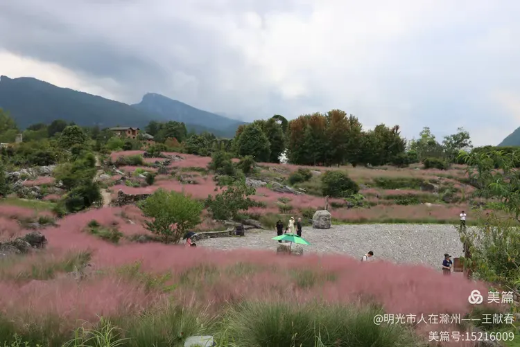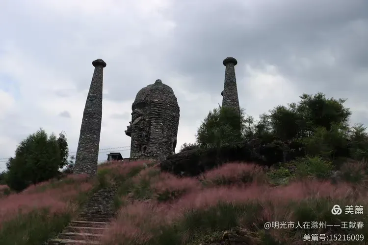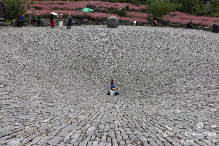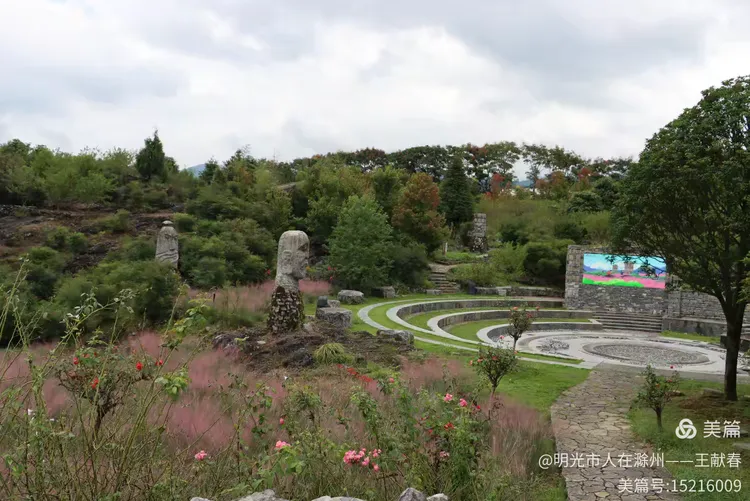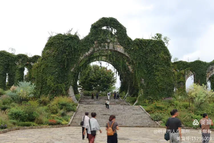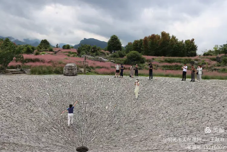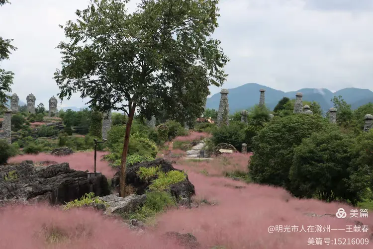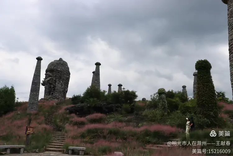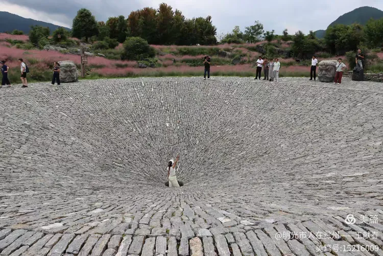 穿过一座被绿色植物覆盖的石拱门,上方有阶梯通向远处,几位游客正在石阶上行走,我也不由自主地踏上台阶,仿佛进入了一个神秘的世界。继续前行,看到一座巨大的石制喇叭形结构,中心站着一个人,周围有游客在拍照,粉红色的植物和远处的石雕让整个场景显得格外独特。在一片开阔的草地上,粉红色的草丛随风起伏,远处有几棵高大的树木和石雕,背景是连绵的山脉,我忍不住在这里多拍了几张照片。
