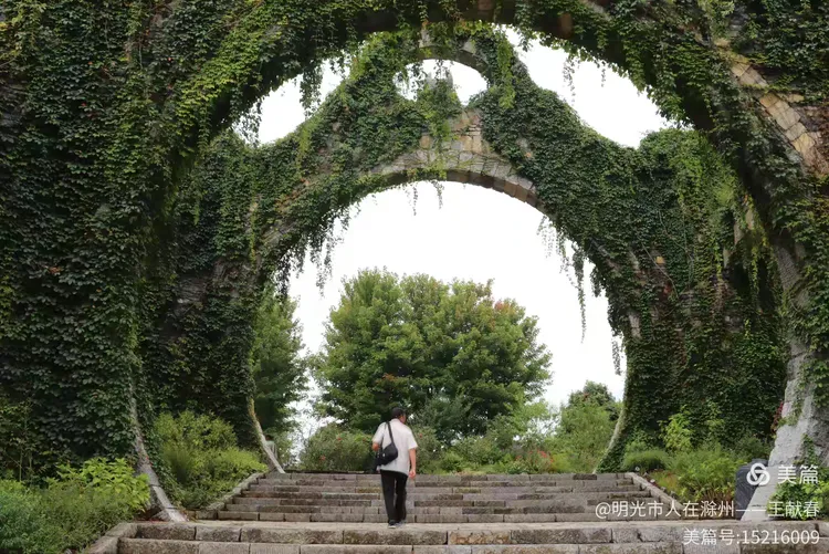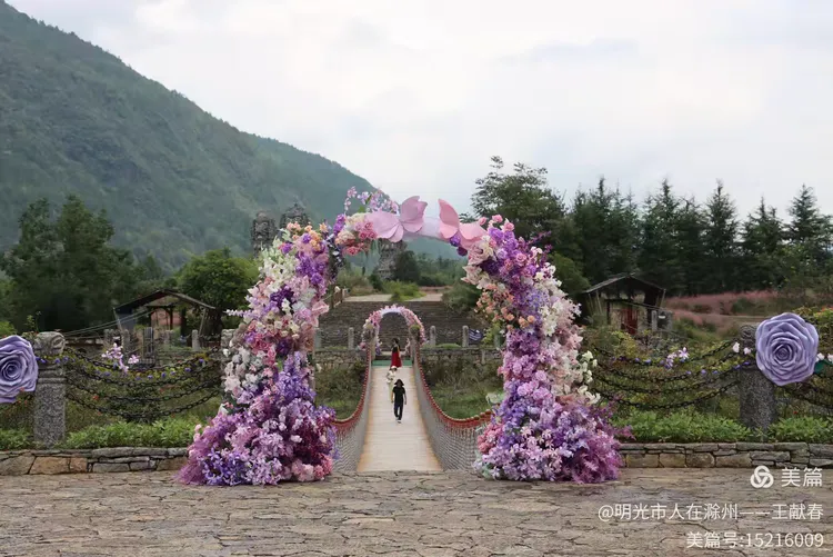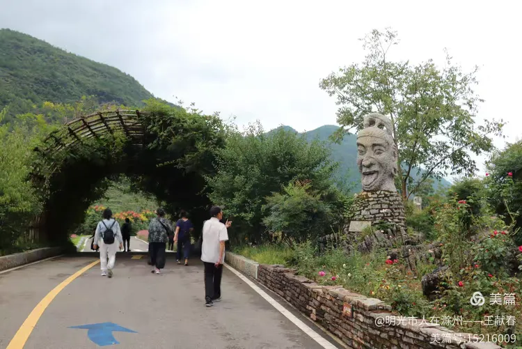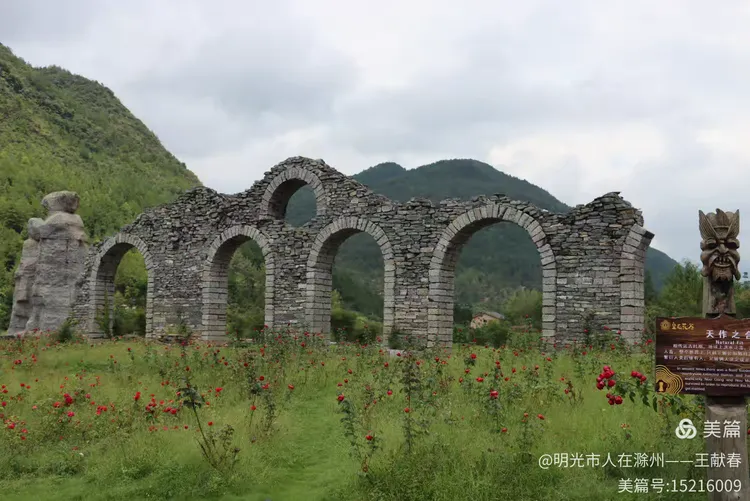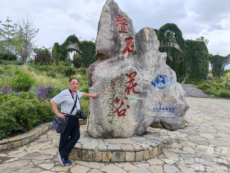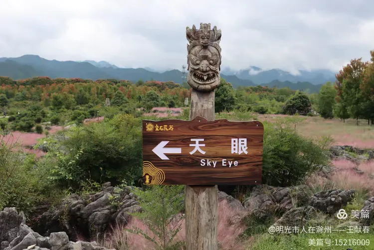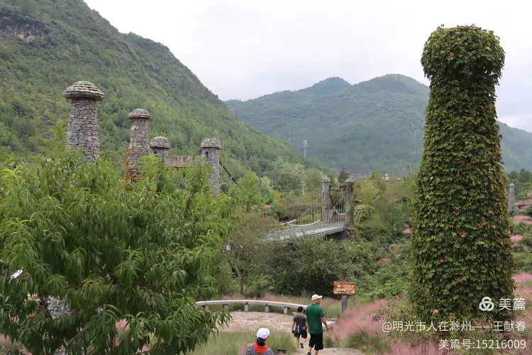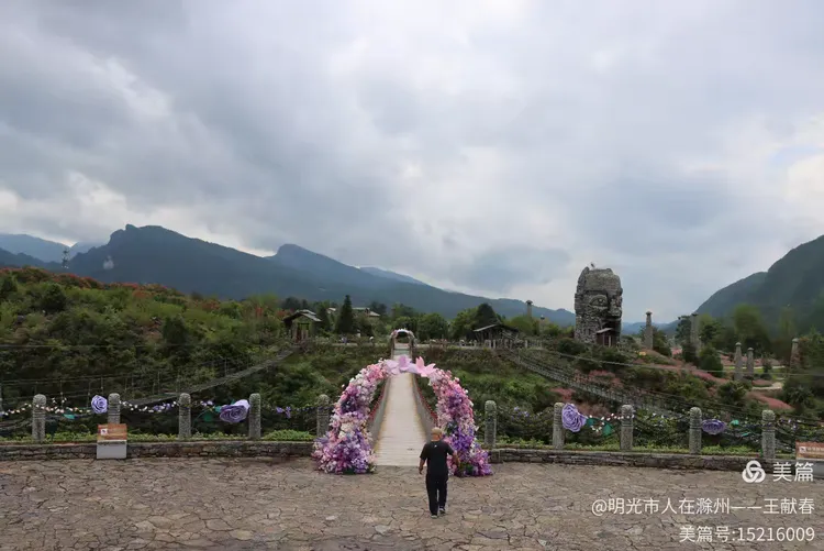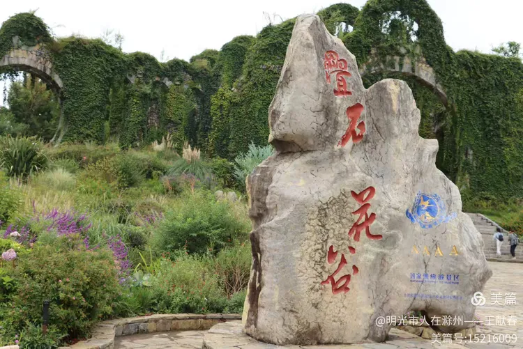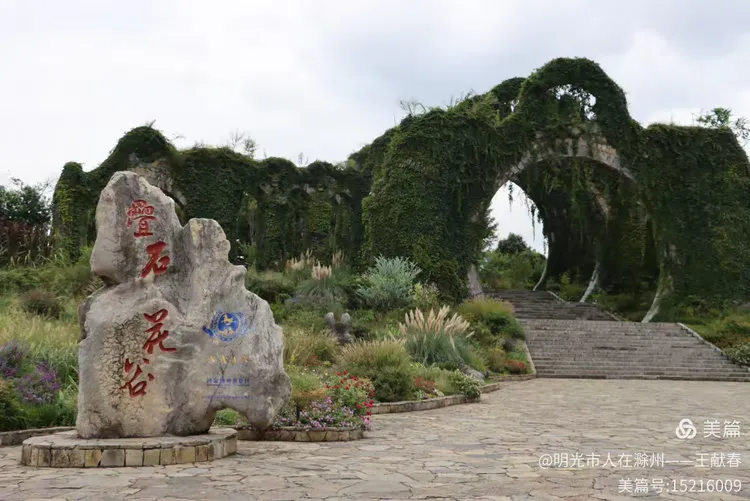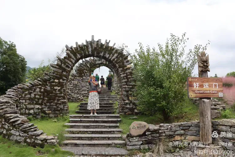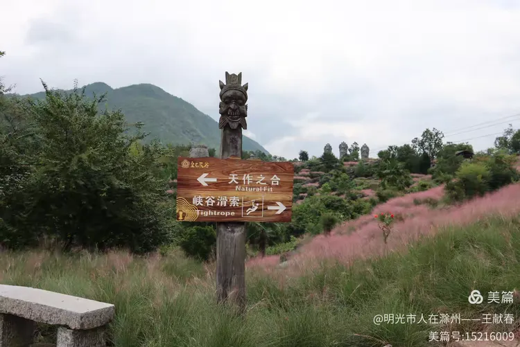 刚走进景区,一块刻着“蟹石花谷”的巨石映入眼帘,旁边是被绿植覆盖的石拱门,周围开满了各色花卉,环境清幽,让人瞬间放松下来。沿着石阶往上走,看到一位游客正站在高处,背景是绿意盎然的石拱门和蓝天白云,他似乎在用镜头记录下这自然与人文交融的美景。路边的木制指示牌上写着“天作之合”和“峡谷滑索”,我决定先去“天作之合”看看,一路上粉红色的草丛随风摇曳,仿佛在为我引路。