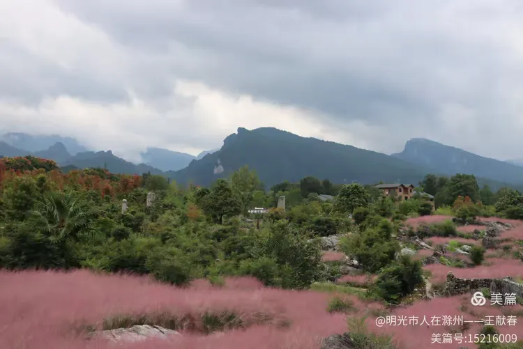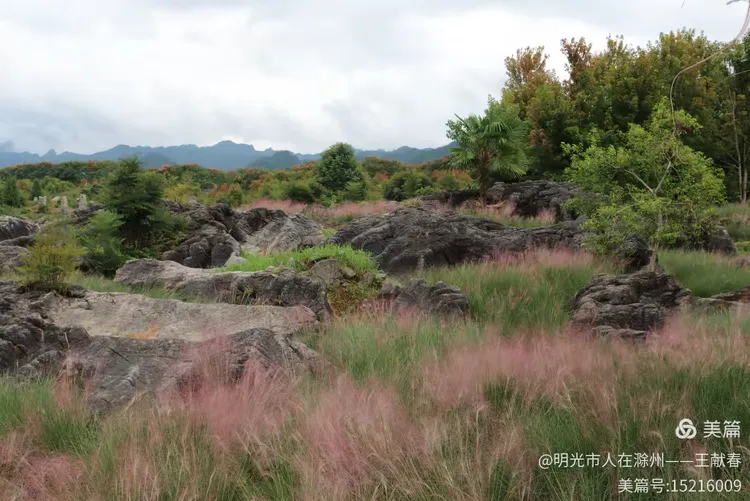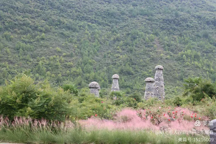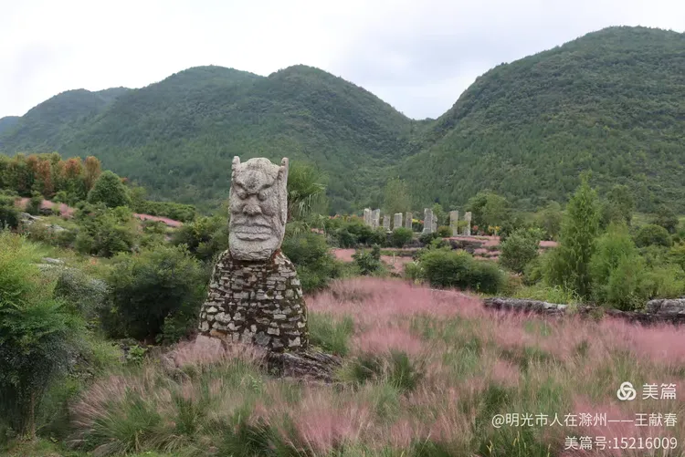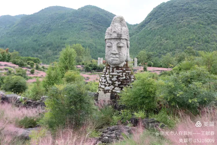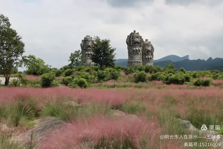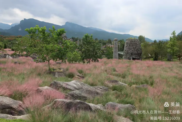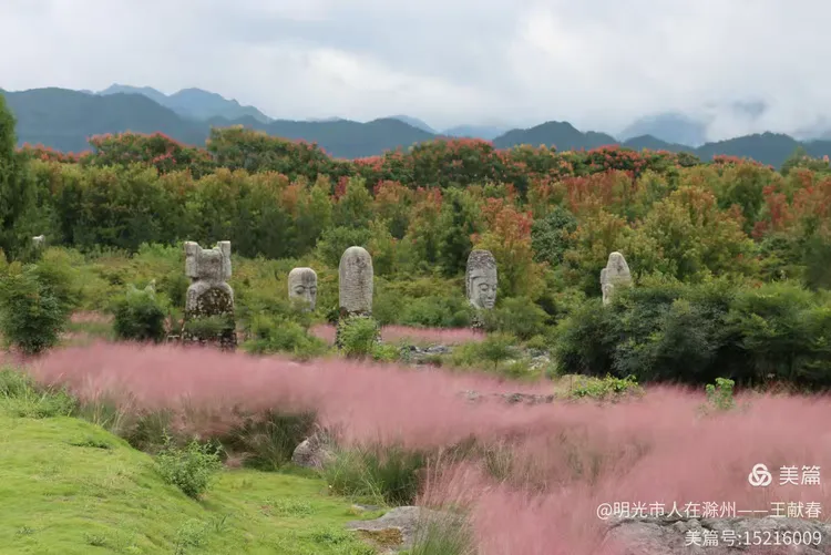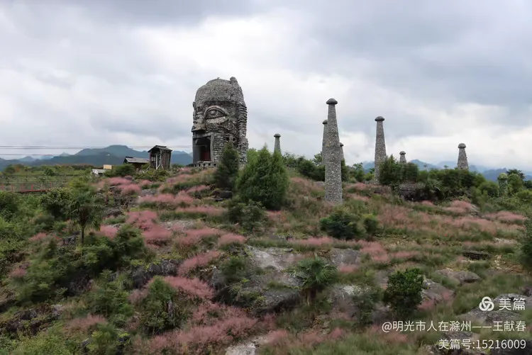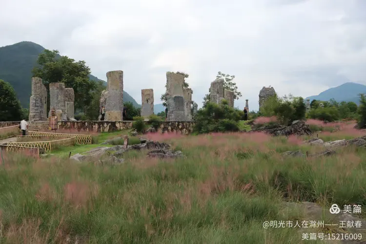 在一片开阔的自然景观中,前景是茂盛的粉红色草丛,中间散布着几块大石头,背景中有几座大型石雕,雕刻风格独特,周围是茂密的绿色植被和远处的山峦,天空多云,整体氛围宁静而神秘,我忍不住在这里多拍几张照片,记录下这美丽的瞬间。