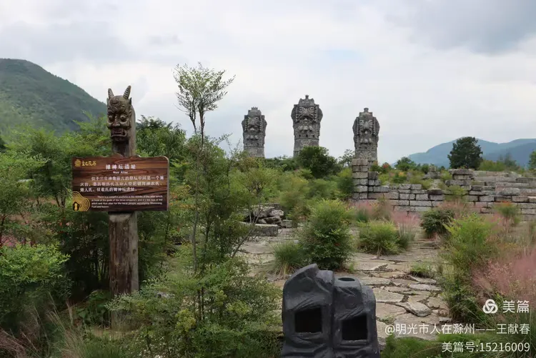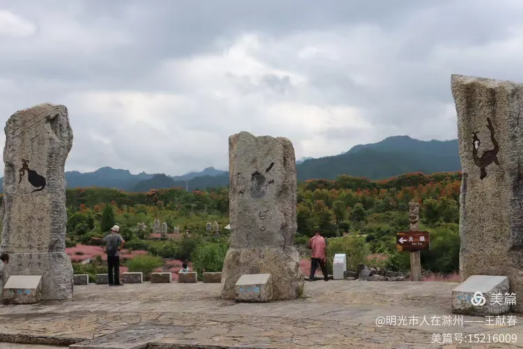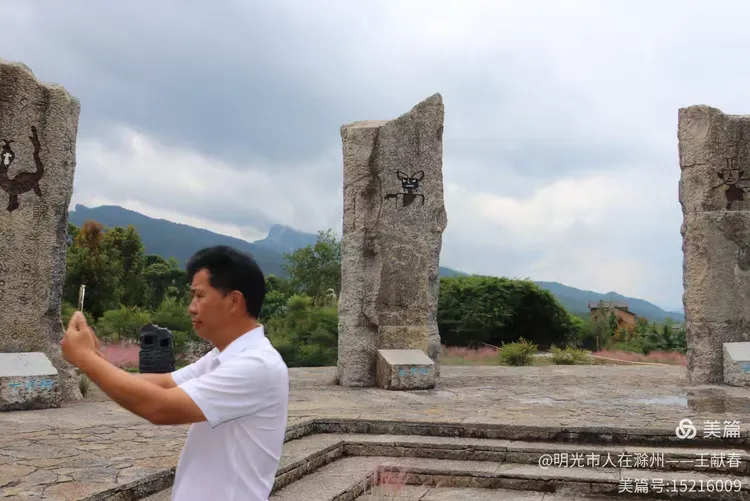 在一处开阔的景观中,三块巨大的石碑矗立在平台上,上面雕刻着不同的图案,天空中竟然出现了彩虹,几位游客在石碑前驻足观看,我也忍不住感叹大自然的神奇。继续前行,看到两根高大的石柱,上面刻有精美的图案,两名男子站在石柱前,似乎在交流着什么,我也凑近观察,感受这些古老艺术的魅力。一位穿着白色上衣的男子正在用手机拍照,背景中有几块刻有图案的石柱,远处是连绵的山脉和茂密的树林,我也不禁举起手机,记录下这美丽的瞬间。