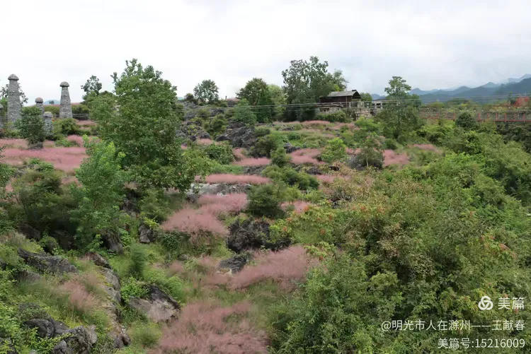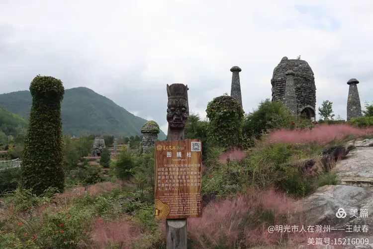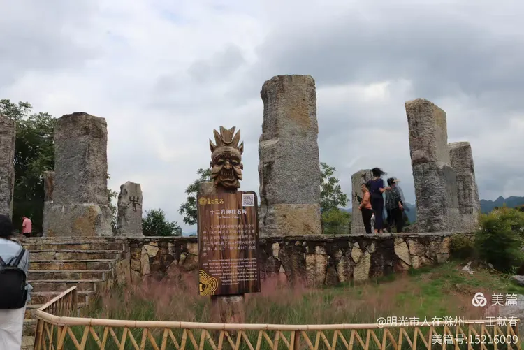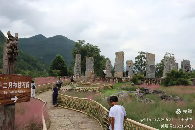 在一片自然景观中,几块形态各异的岩石上覆盖着粉红色的植被,背景是连绵的山脉和绿色的树木,中间有一个木制的信息牌,我一边阅读一边欣赏这宁静而美丽的景色。在“十二月神柱石阵”前,几根高大的石柱整齐排列,石柱上雕刻着古老的图案,几位游客正在石阵中行走,我也忍不住走进其中,感受这神秘的氛围。一条蜿蜒的石板小路通向一座吊桥,桥的尽头是几座石塔,塔顶有独特的蘑菇状装饰,几位游客在桥边欣赏风景,我也忍不住驻足拍照。