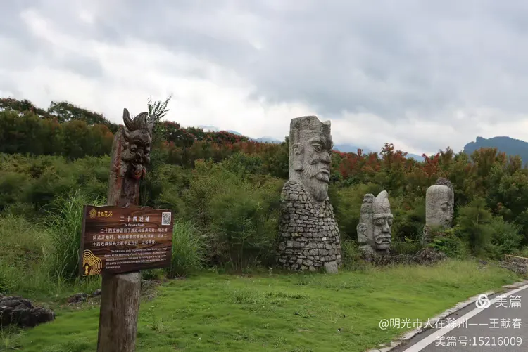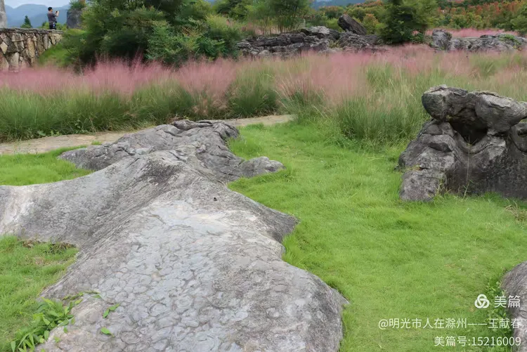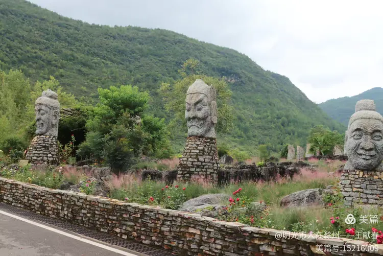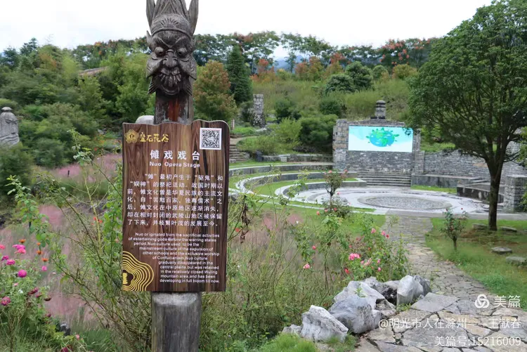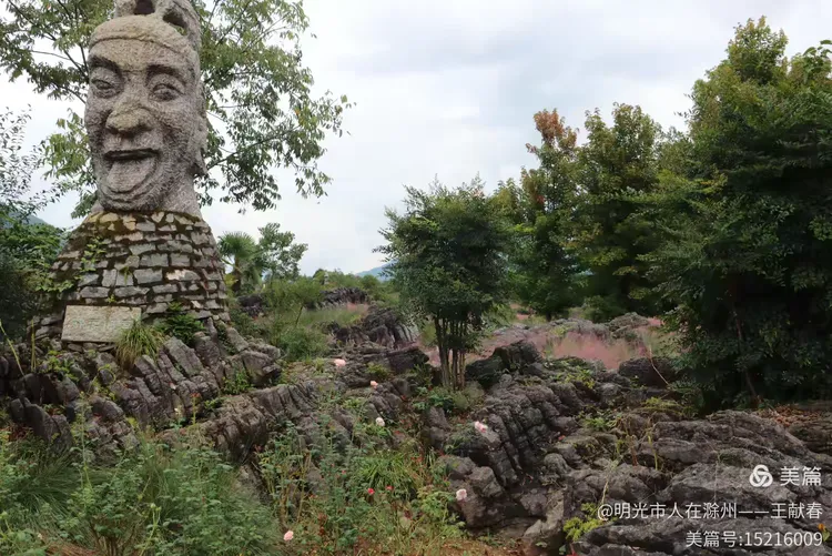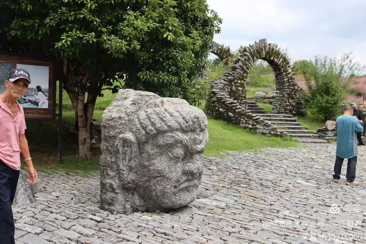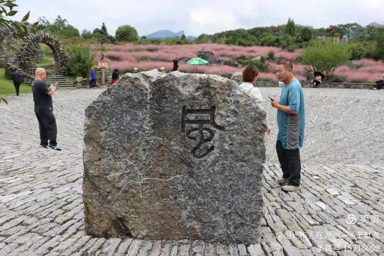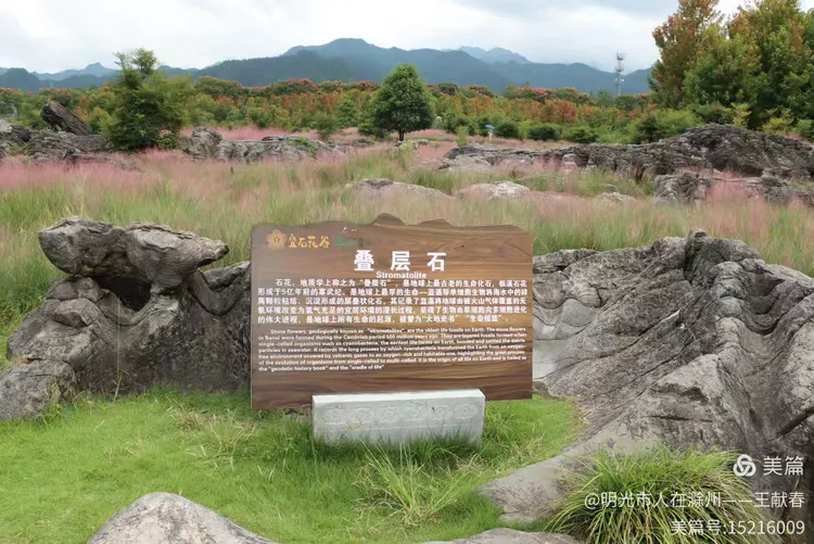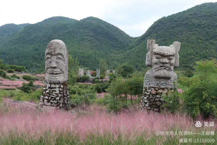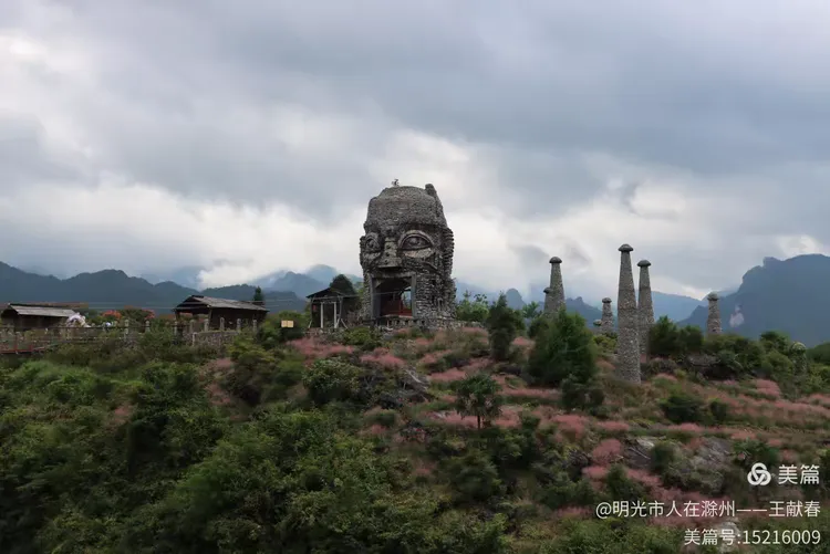 景区的宣传牌详细介绍了酉阳叠石花谷的特色,包括叠层石的形成和傩文化的渊源。我一边阅读,一边欣赏旁边的三座石雕人物,他们表情各异,仿佛在诉说着古老的故事。继续前行,路边又出现了几座石雕,它们静静地伫立在山丘之间,仿佛守护着这片土地。不远处是一片开阔的草地,粉红色的植物铺满地面,几个游客正在远处拍照,我忍不住也拿出手机,记录下这梦幻般的景色。