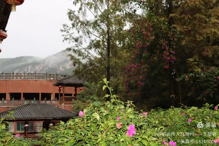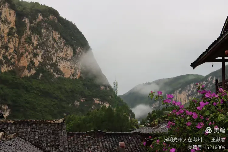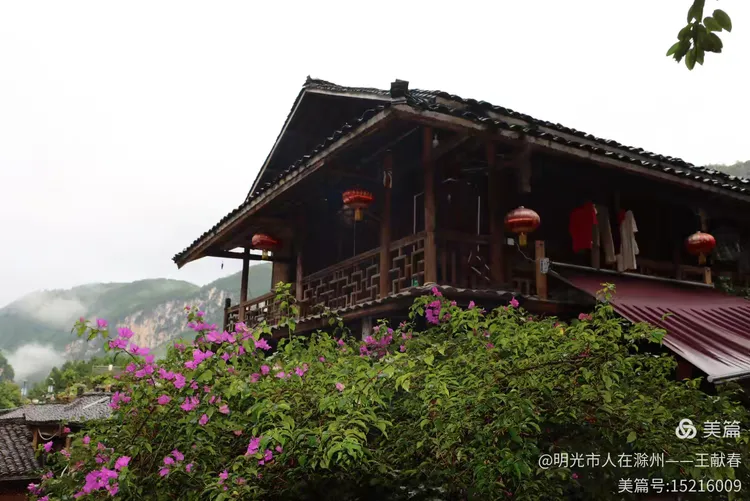继续前行,我来到了一座高耸入云的山峰下。山间云雾缭绕,显得神秘而壮丽。屋檐下几朵盛开的紫色花朵点缀其间,与远处的山景形成鲜明对比。传统的瓦片屋顶为这片自然景色增添了几分古朴的气息,仿佛在诉说着龚滩古镇悠久的历史。
