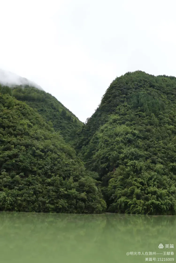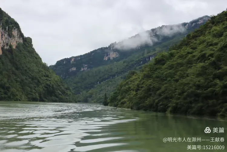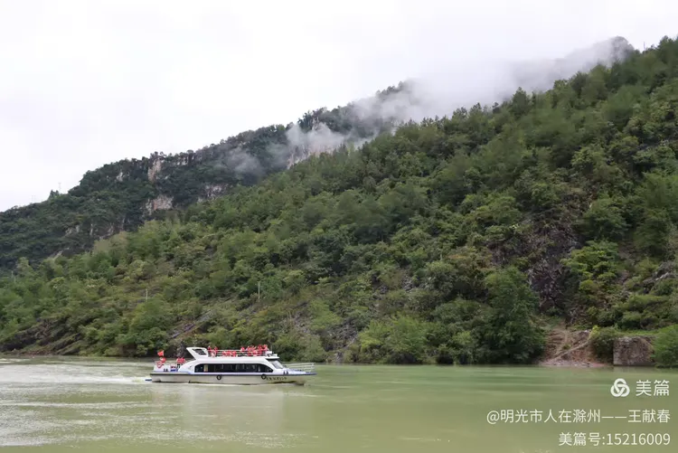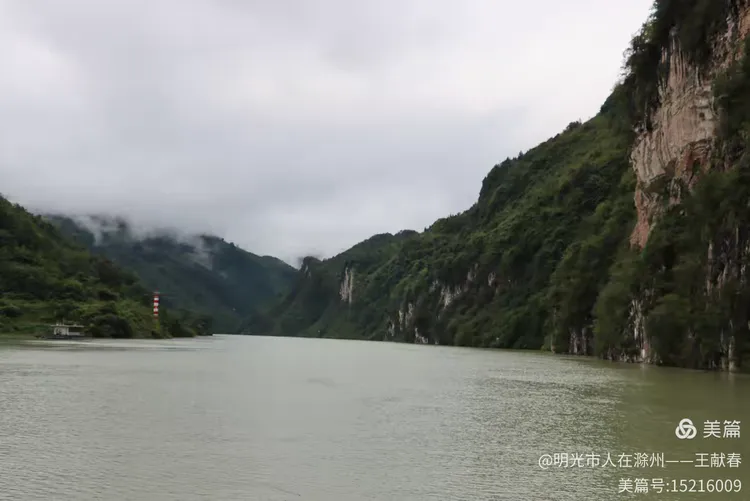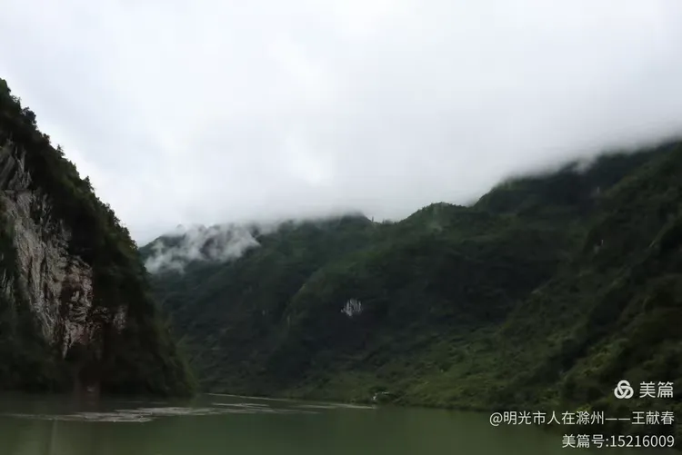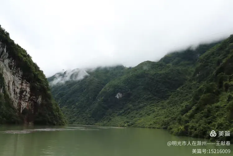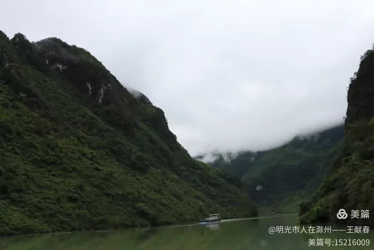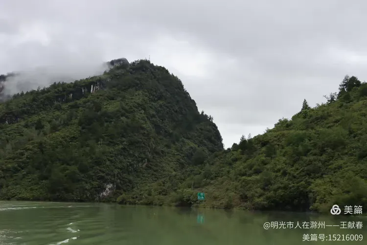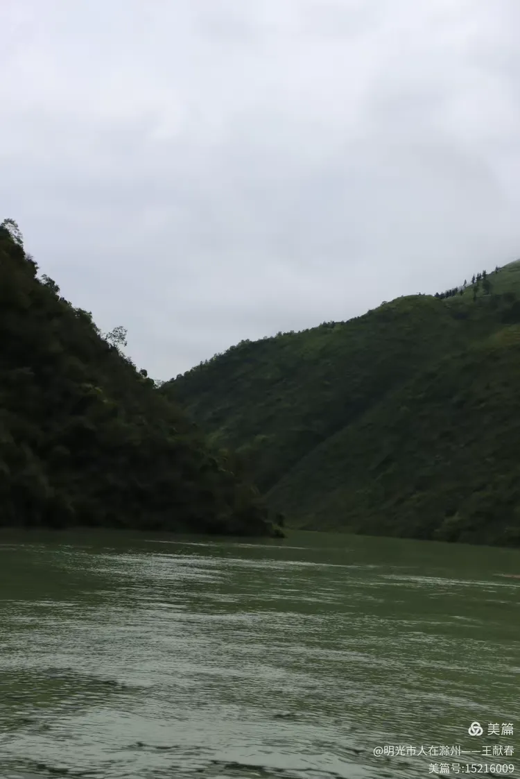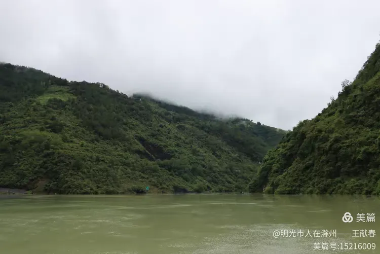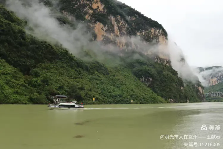 一艘船在绿色的江面上行驶,江水呈现出浑浊的绿色,背景是覆盖着绿色植被的山峦,山间有雾气缭绕。我望着远处的山峰,心中充满了对这片土地的热爱与敬畏。