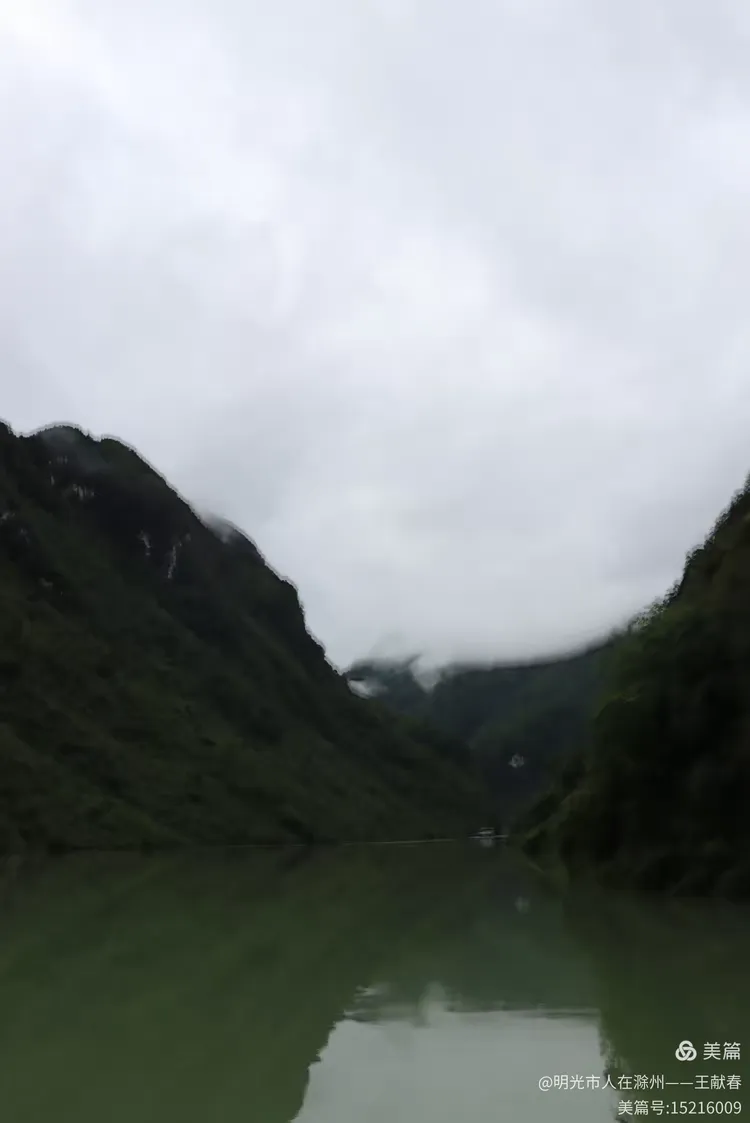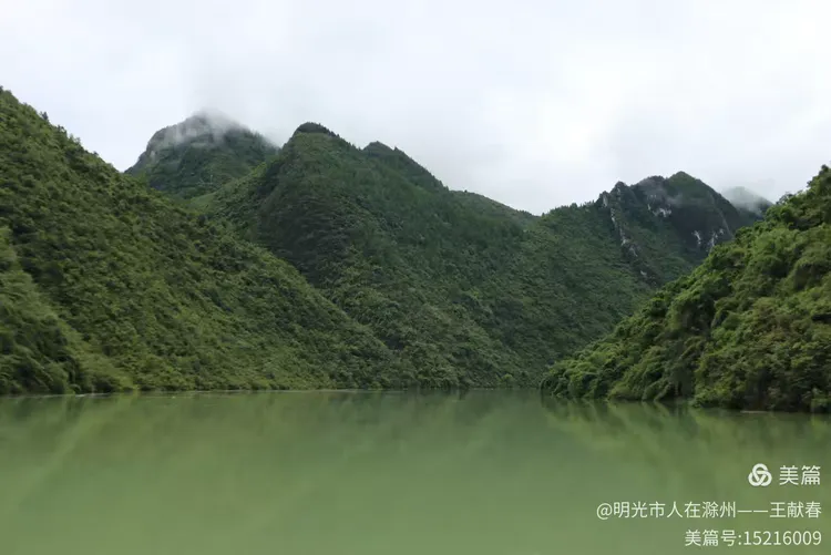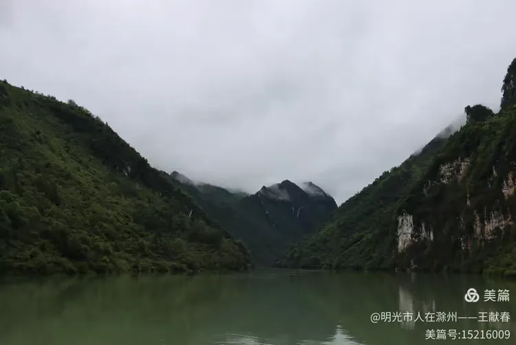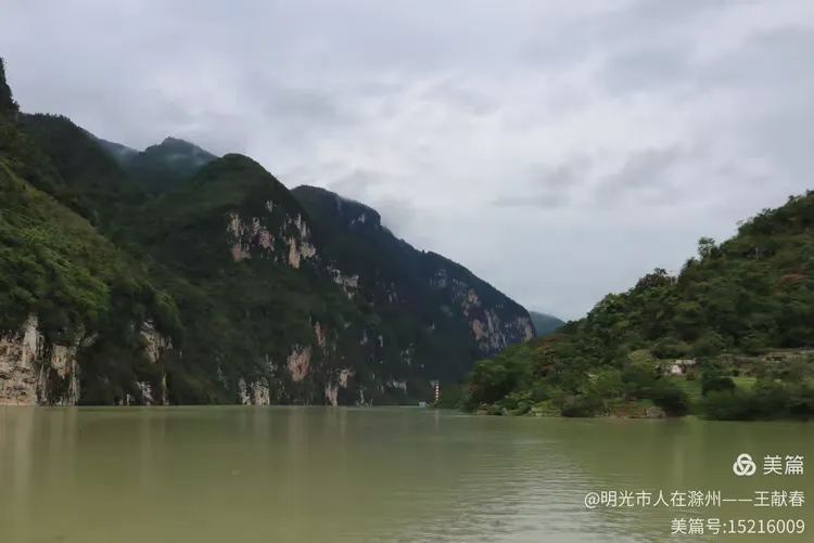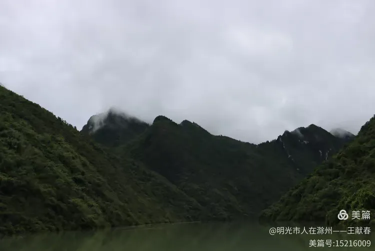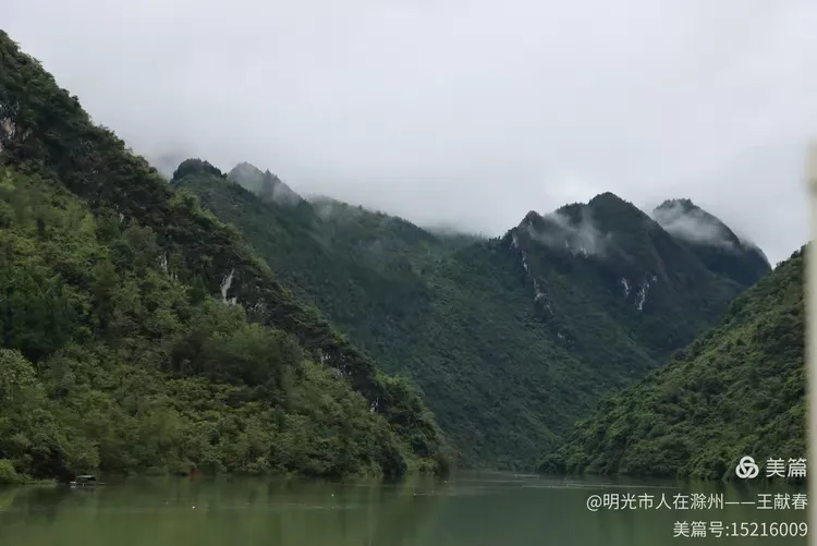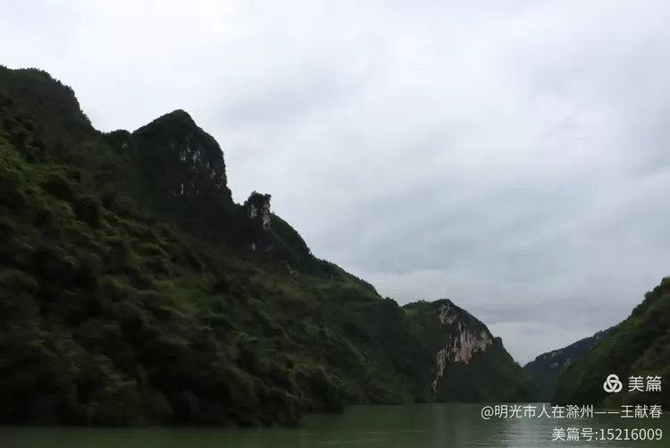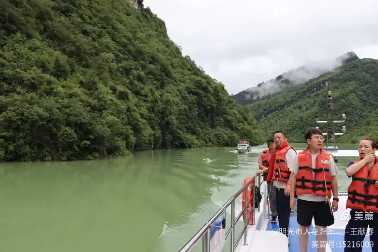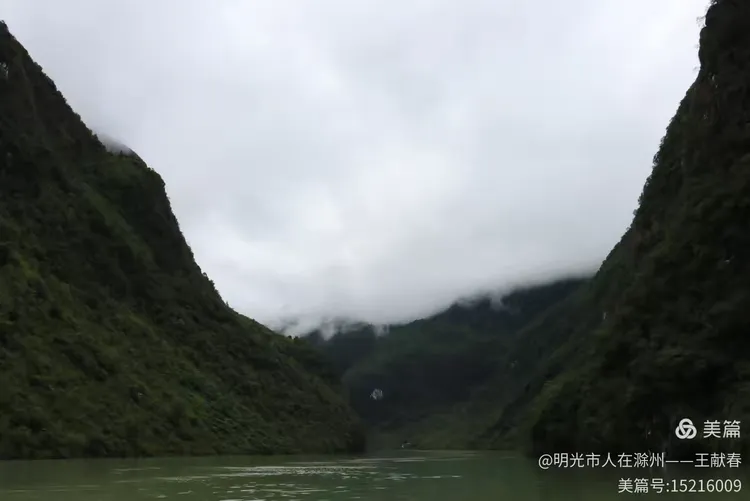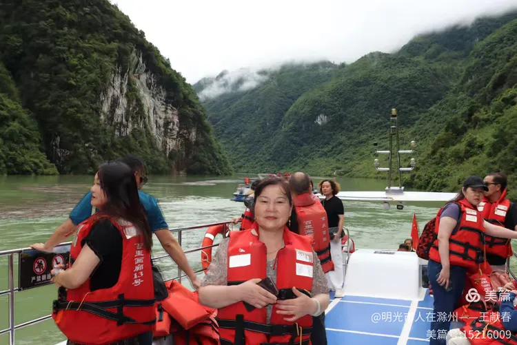 一艘船在绿色的江面上行驶,江水呈现出浑浊的绿色,背景是覆盖着绿色植被的山峦,山间有雾气缭绕。我望着远处的山峰,心中充满了对这片土地的热爱与敬畏。