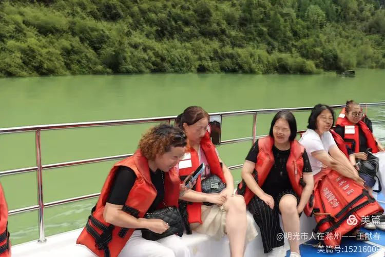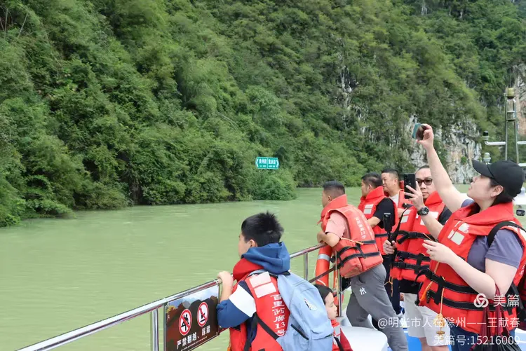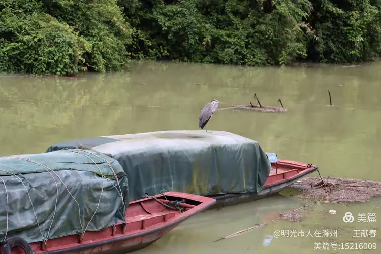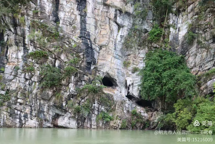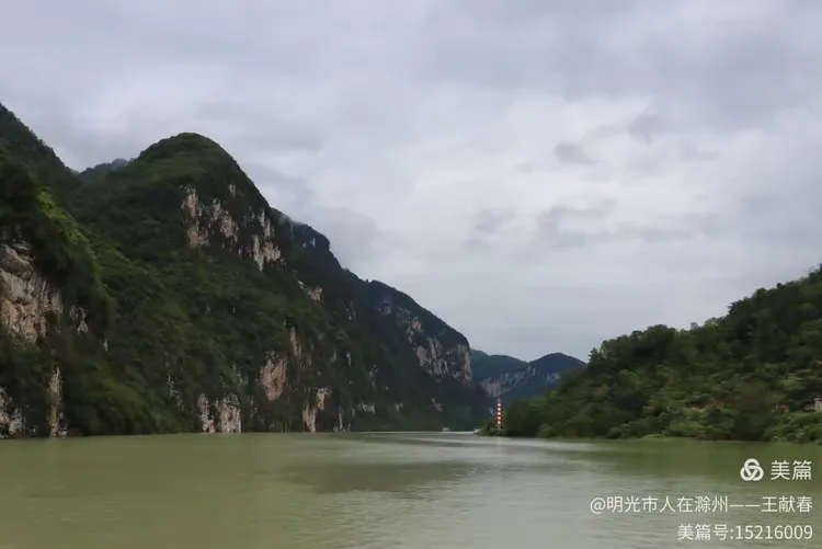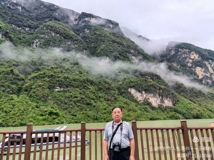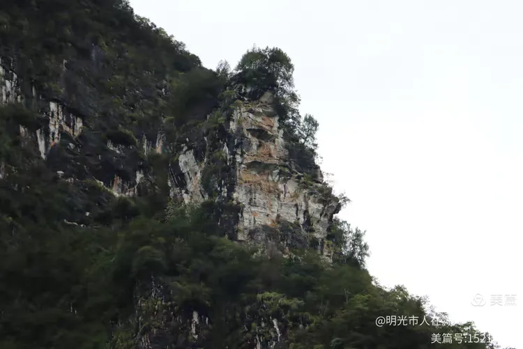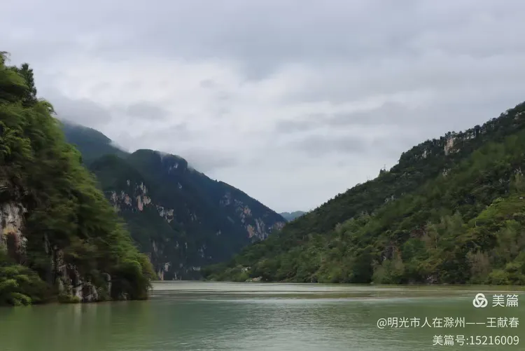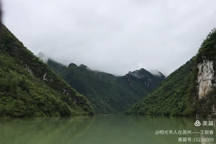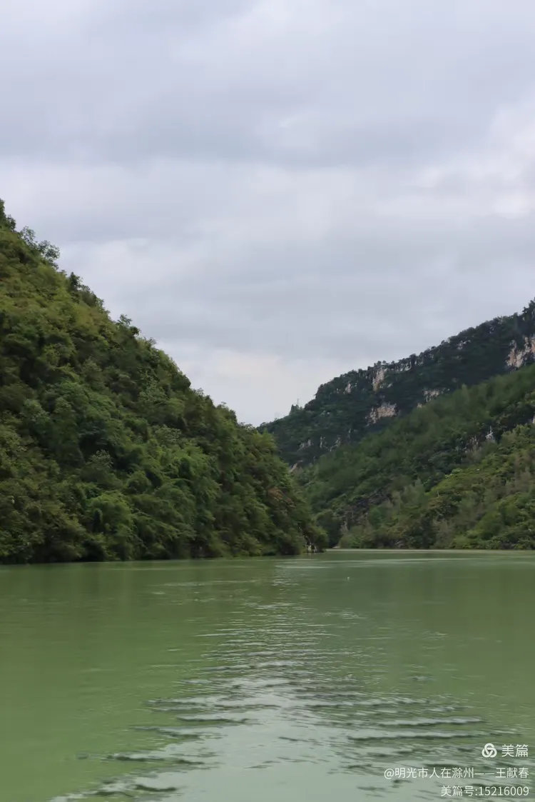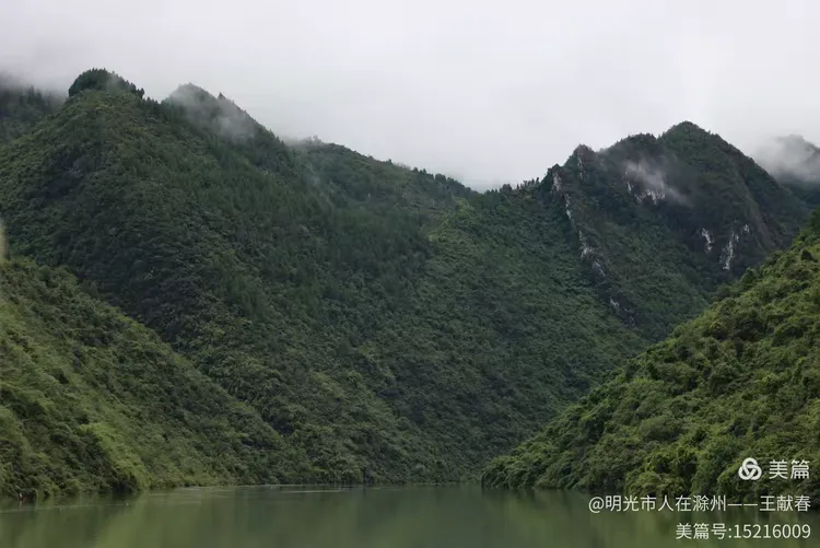 一艘船在绿色的江面上行驶,江水呈现出浑浊的绿色,背景是覆盖着绿色植被的山峦,山间有雾气缭绕。我望着远处的山峰,心中充满了对这片土地的热爱与敬畏。