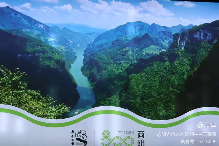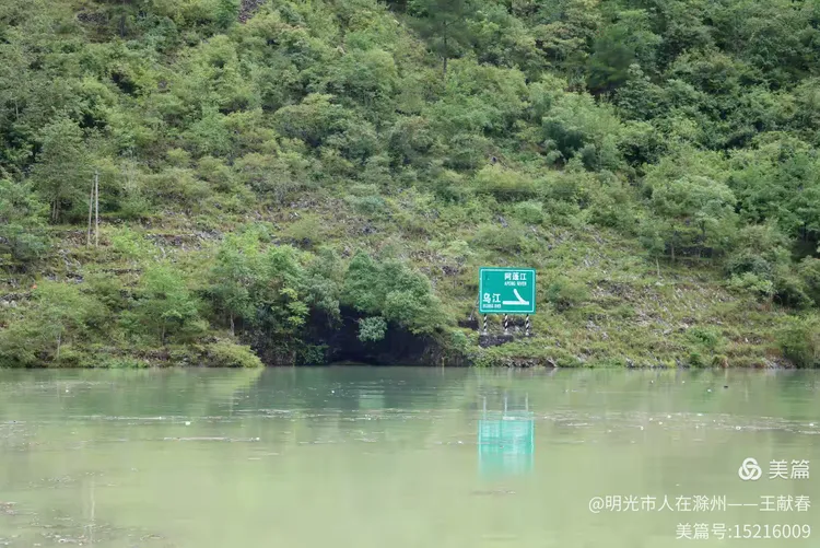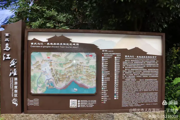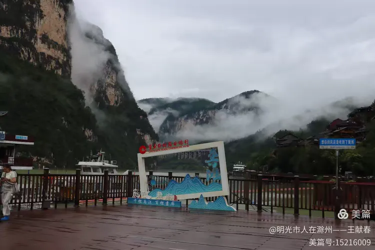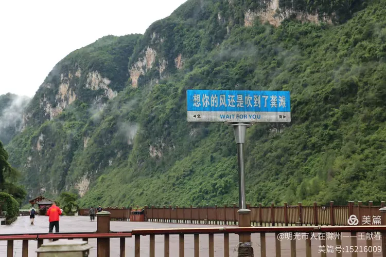 栈道旁有一个蓝色的指示牌,上面写着“想你的风还是吹到了龚滩”和“WAIT FOR YOU”。我站在栈道上,望着远处的山峦,心中涌起一股莫名的感动。这里的一切都让人感到宁静与美好。