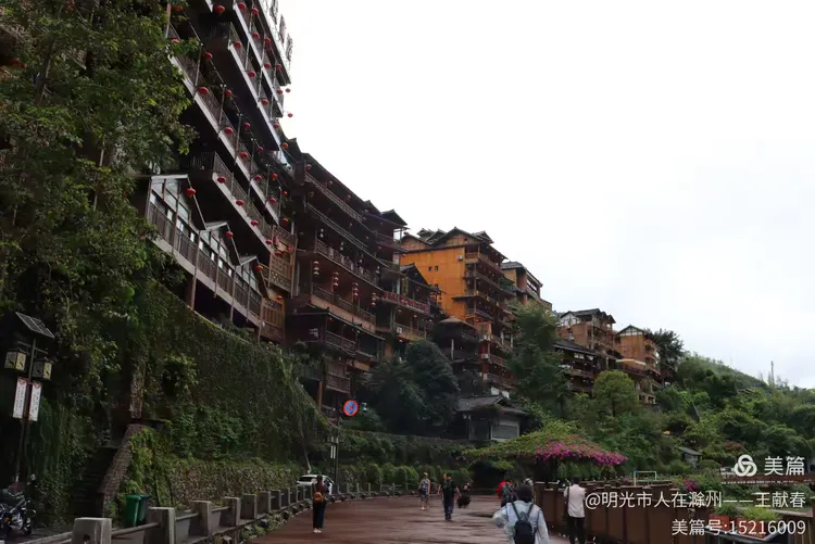 我站在木质栈道上,背景是覆盖着绿色植物的多层建筑,建筑上有红色的灯笼装饰。我面带微笑,手里拿着一个包,感受着这片土地的宁静与美好。