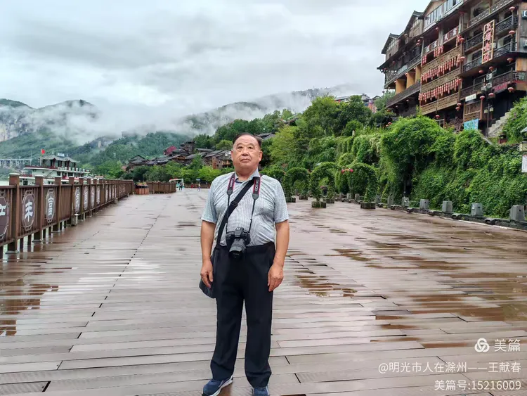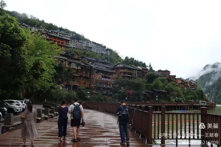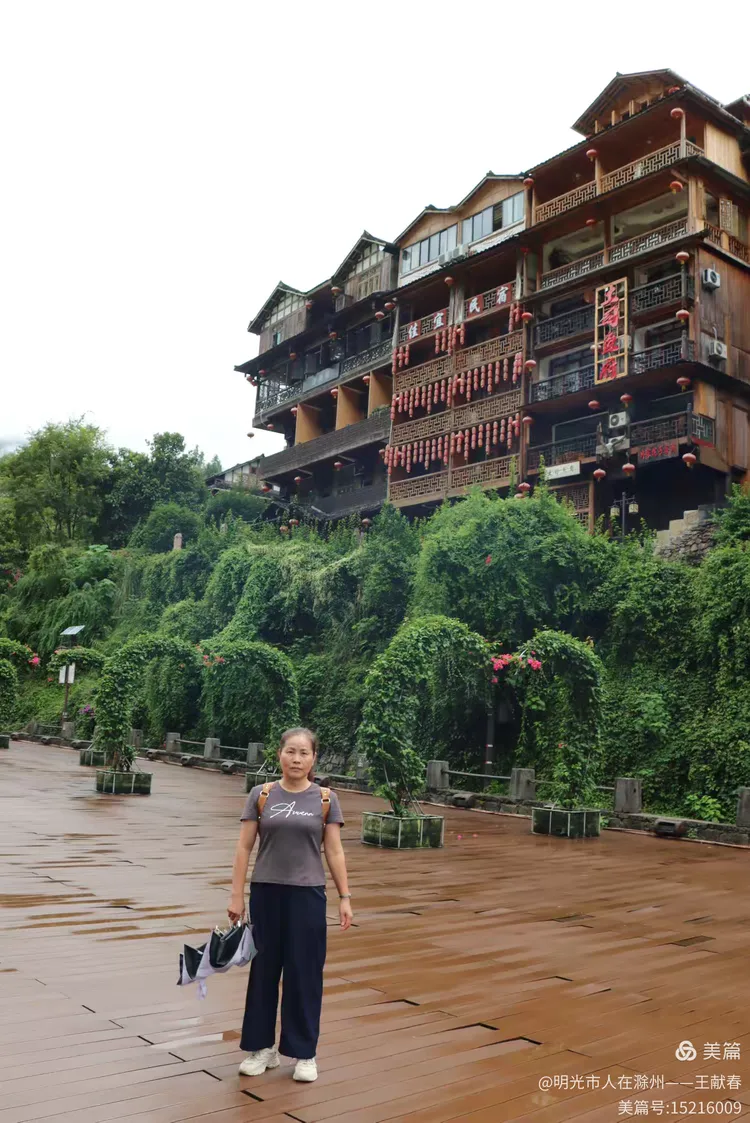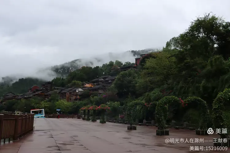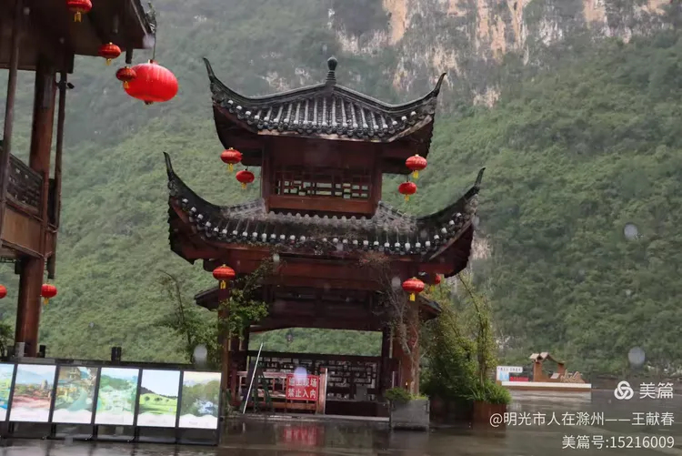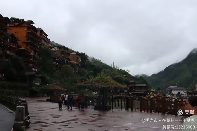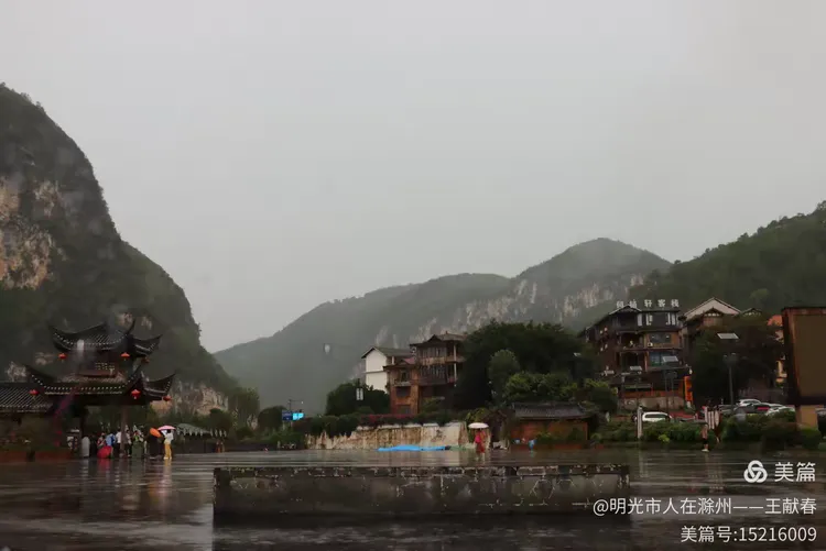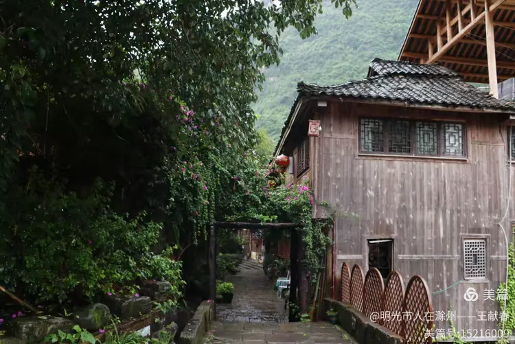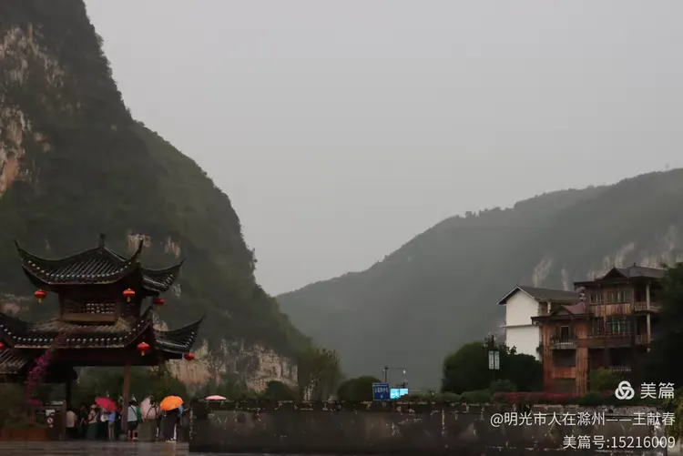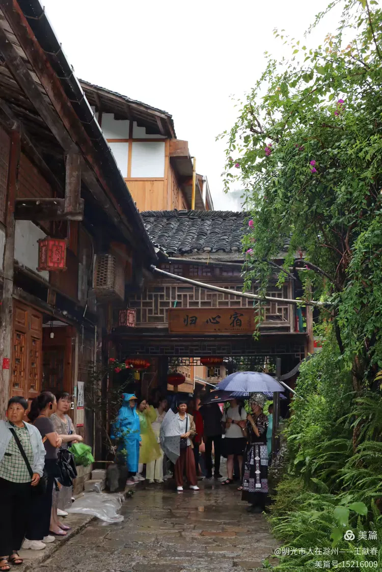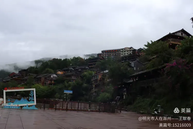今天上午,我漫步在龚滩古镇的石板街上,雨水打湿了脚下的青石,也洗净了古镇的尘埃。远处的山峦在云雾中若隐若现,仿佛一幅水墨画。古建筑的飞檐翘角在雨中显得格外沉静,而街道旁的现代商铺却透着一丝热闹。撑着伞的行人缓缓走过,每一步都像是踏进了时光的深处。这里没有喧嚣,只有宁静与古朴交织出的诗意。
