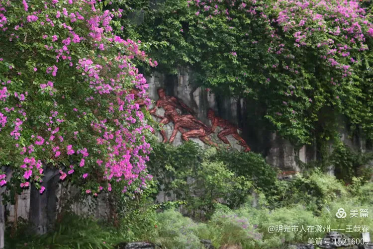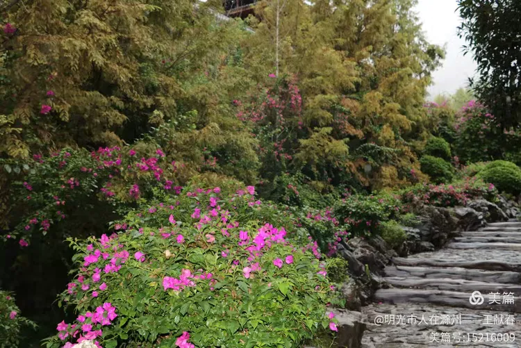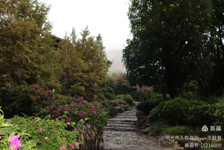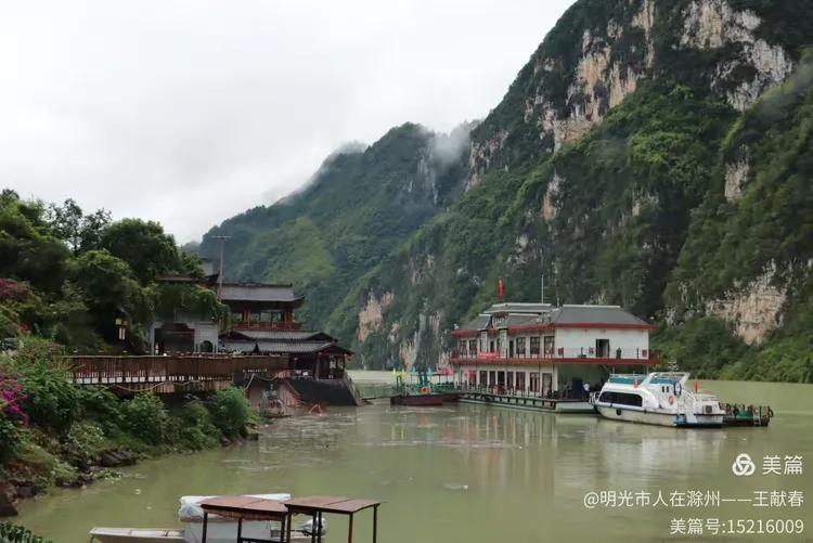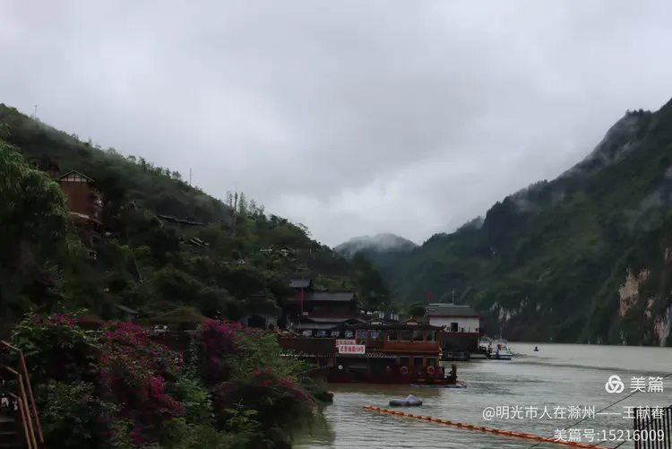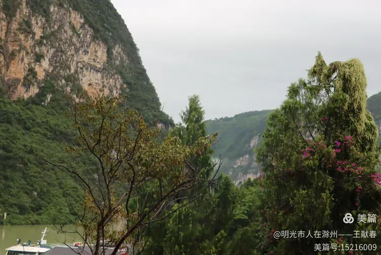 沿着江边的石阶而行,绿意盎然的花园中,粉色的花朵点缀在两旁,远处隐约可见山峦起伏。我仿佛走进了一幅山水画卷,每一步都踏在自然的韵律之中。山间的绿树成荫,江水蜿蜒,一艘游船静静地泊在水面,远处的峭壁高耸入云,近处的树木郁郁葱葱,一切都显得那么宁静而古朴。
