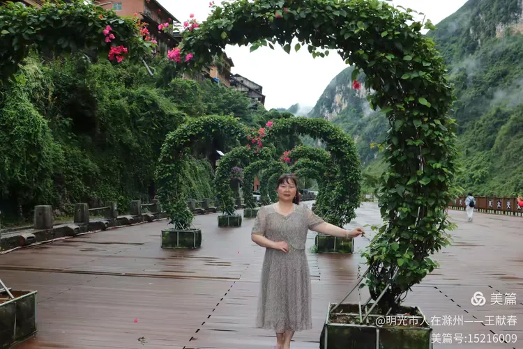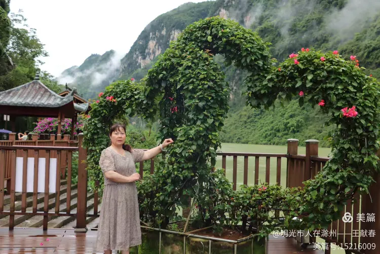 站在木质平台上,背景是茂密的绿色植被和远处的山峦,我身后有一个装饰有绿色藤蔓和粉色花朵的拱门,平台上有一个传统风格的凉亭,周围环境显得宁静而美丽。