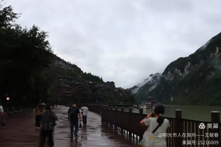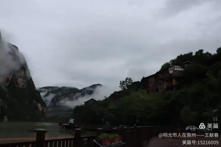 河边的景色显得格外宁静,天空阴沉,云层厚重,远处的山峦被云雾笼罩,显得朦胧而神秘。河边的几栋传统建筑依山而建,显得古朴而宁静。我沿着木制的栈道前行,栈道旁停着几艘小船,整体氛围宁静而略带忧郁。