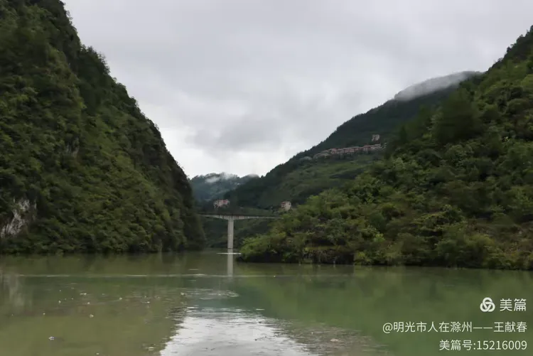 一条河流蜿蜒穿过山谷,两岸是高耸的山峰,山峰上覆盖着浓密的植被,云雾缭绕,远处可以看到一座桥梁横跨河流,整体景色显得宁静而神秘。我站在桥上,感受着这片土地的宁静与美好。