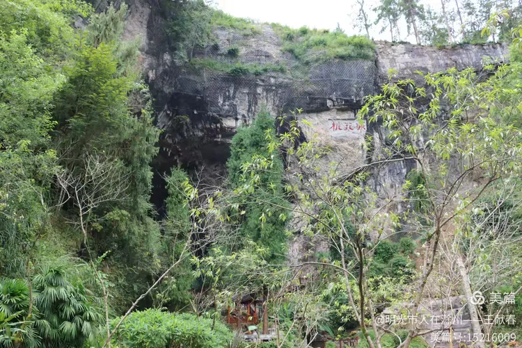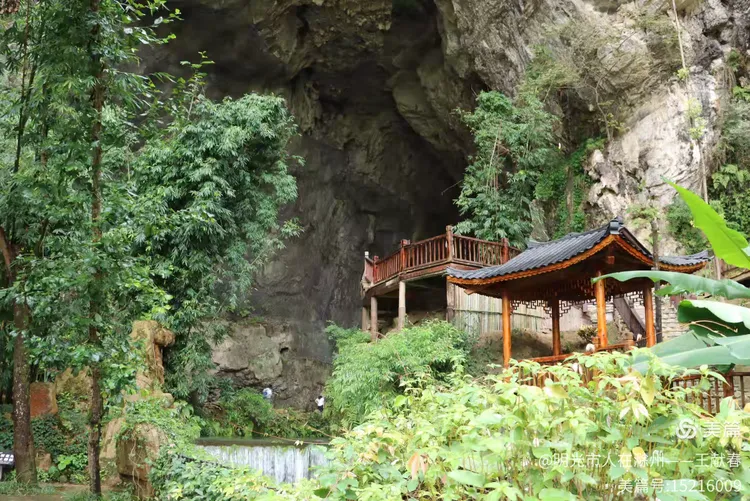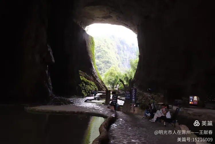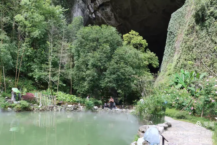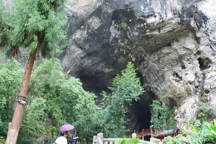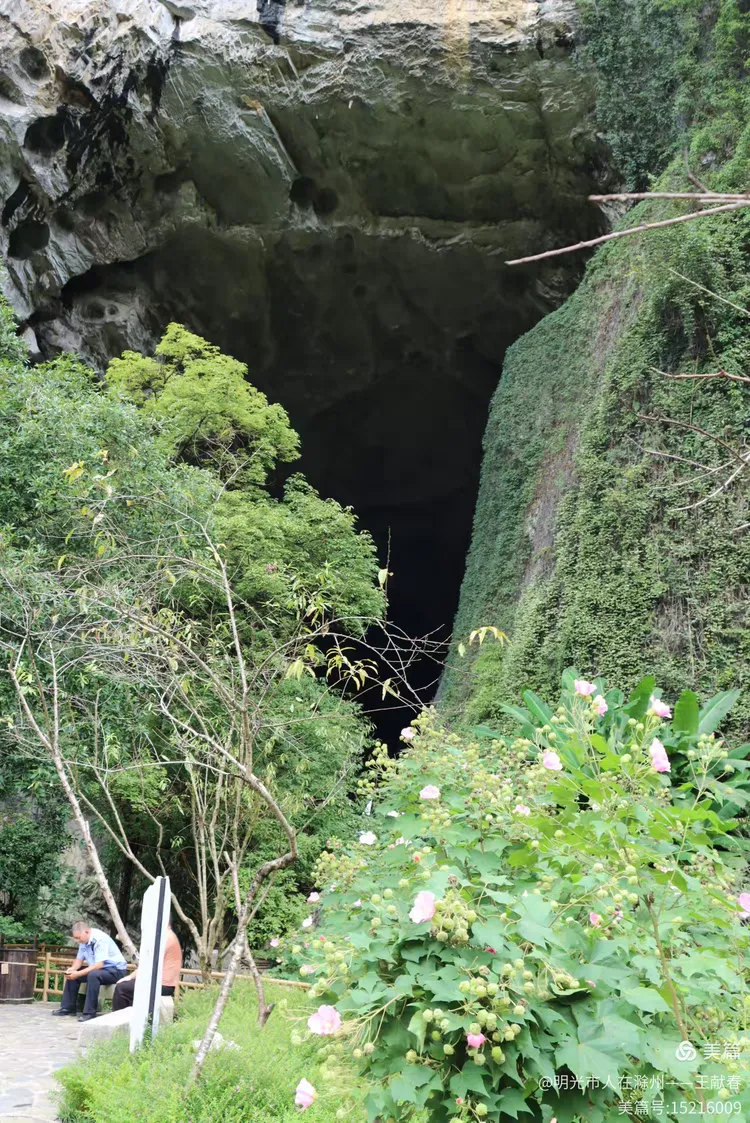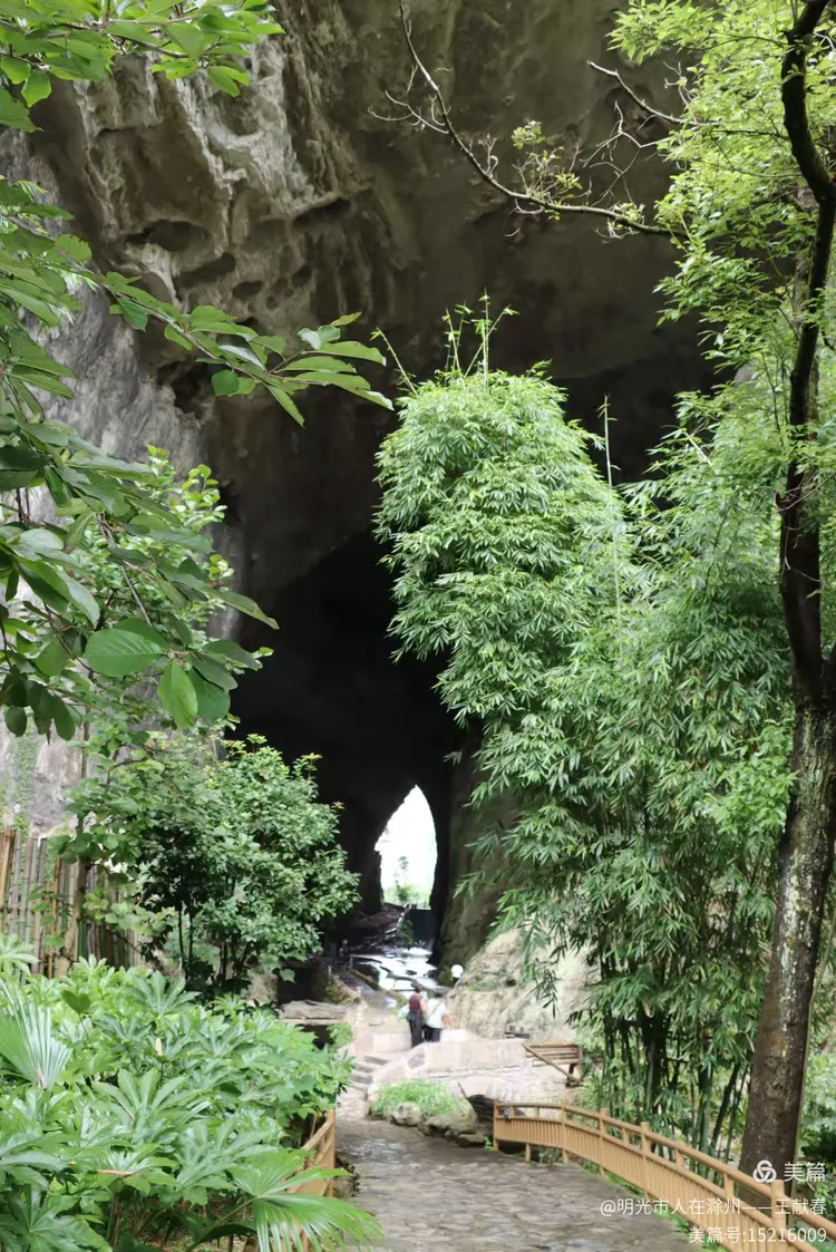 继续深入,便来到了一个天然的洞穴入口,洞穴周围生长着茂密的植被,洞口上方覆盖着绿色的植物,洞口下方有几棵树木,洞口附近有几个人在拍照或参观,旁边有一条小径通向洞口。整个场景显得幽静而神秘,仿佛置身于一幅山水画卷之中。